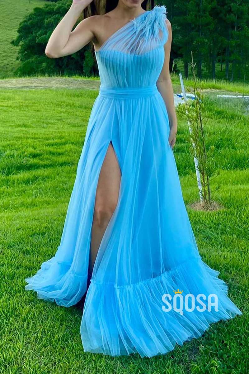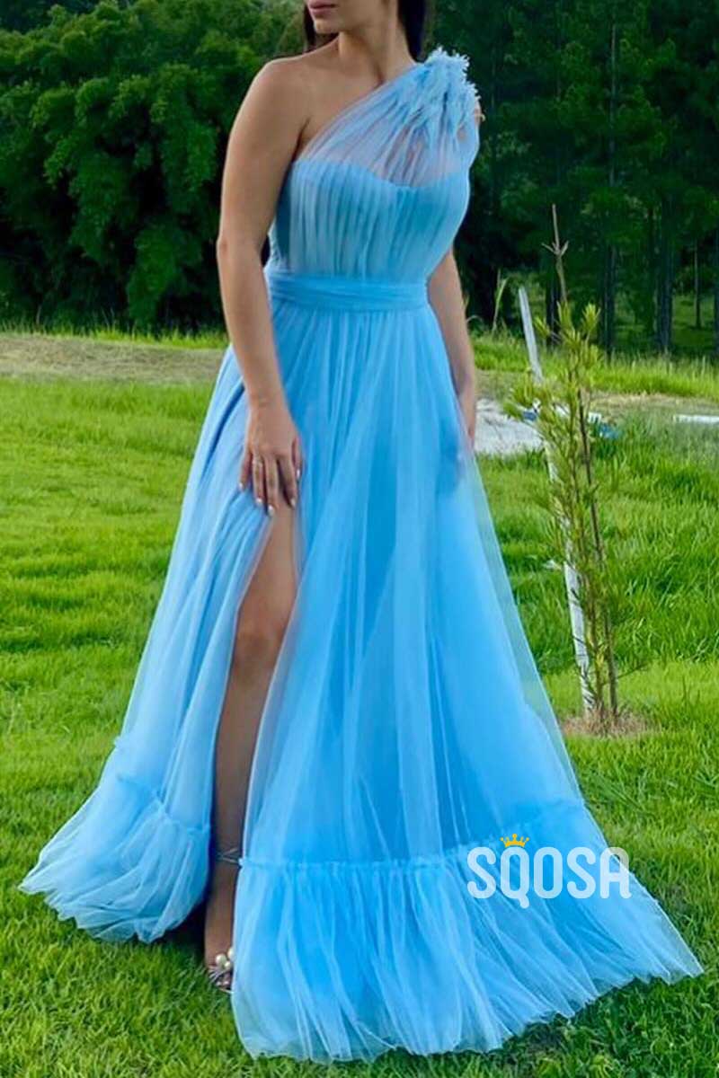Tulle A-Line One Shoulder Sleeveless With Side Slit Party Prom Evening Dress QP3445