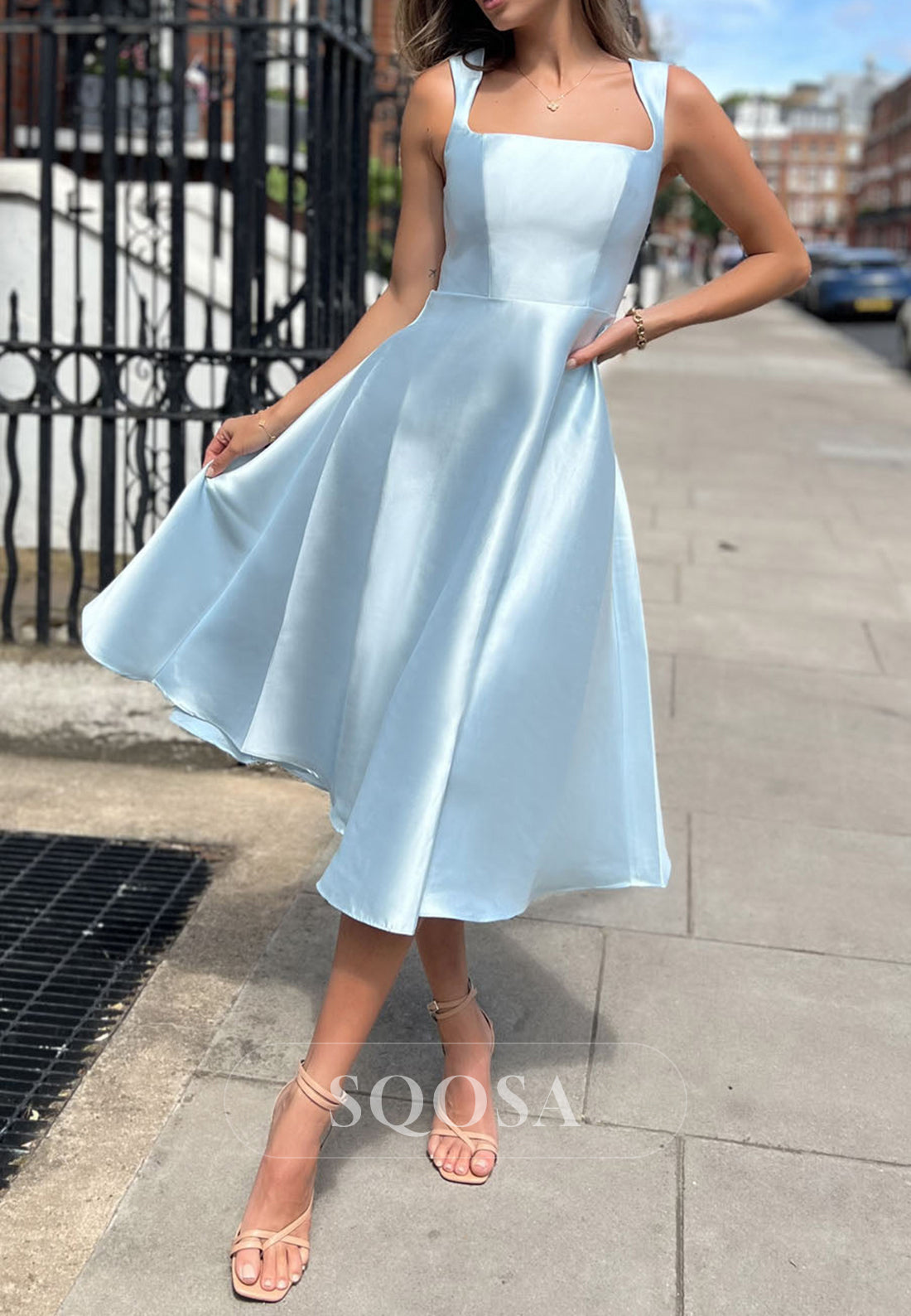 Elegant Satin A-Line Square Sleeveless Party Prom Evening Dress