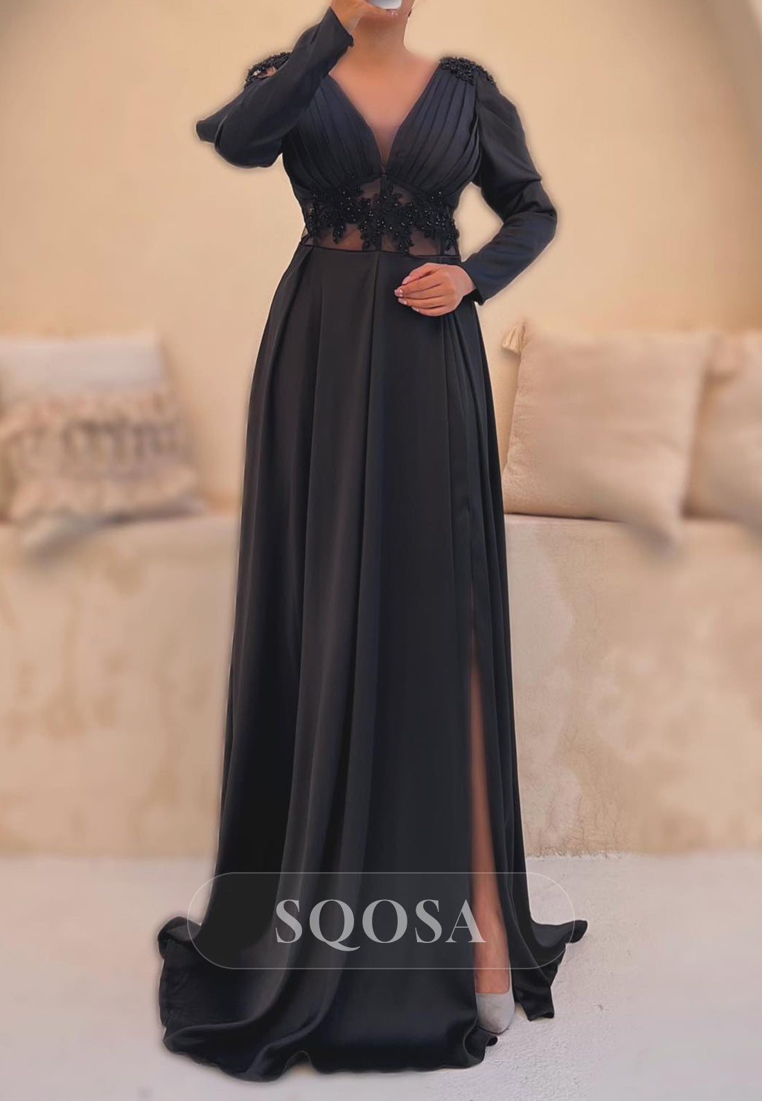 This elegant Satin A-Line V-Neck Long Sleeve Appliques Party Prom Evening Dress QP3555 is the perfect choice for any special occasion. Made from high-quality satin fabric, this dress features a flattering A-line silhouette and intricate appliques, adding a touch of sophistication. With its v-neckline and long sleeves, it offers both style and comfort. Make a statement at your next event with this stunning dress.