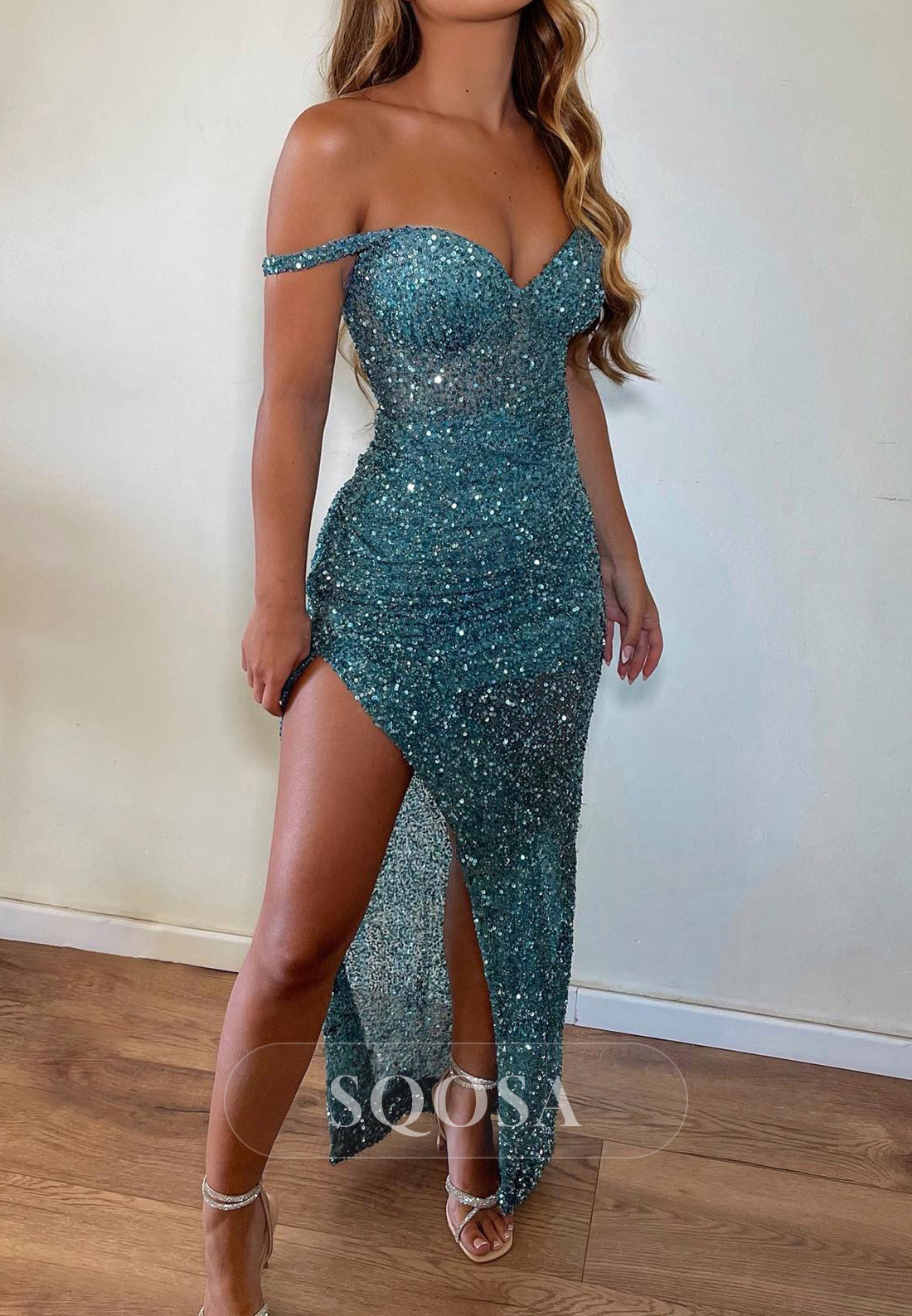 Sexy Fitted Off-Shoulder Sequined With Side Slit Party Prom Evening Dress QP3564