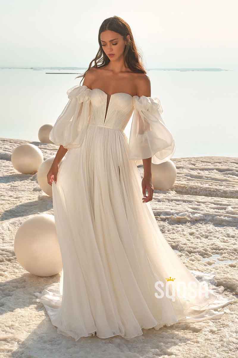 A Line Deep V neck Long Sleeves Elegant Tulle Modern Wedding Dress with Slit QW2174