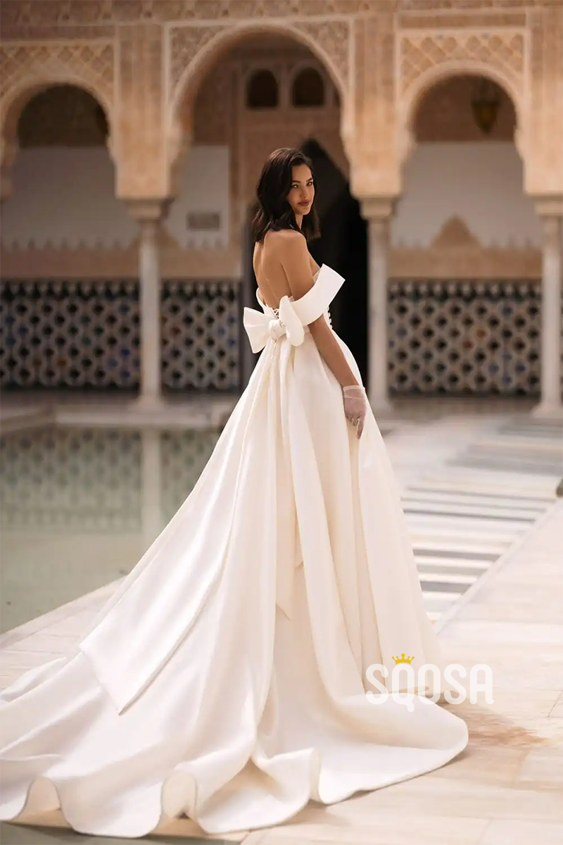 A Line V neck Satin Pleats Elegant Wedding Dress with Slit QW2316