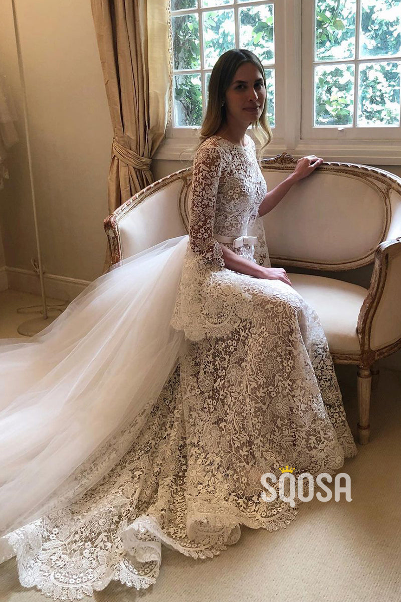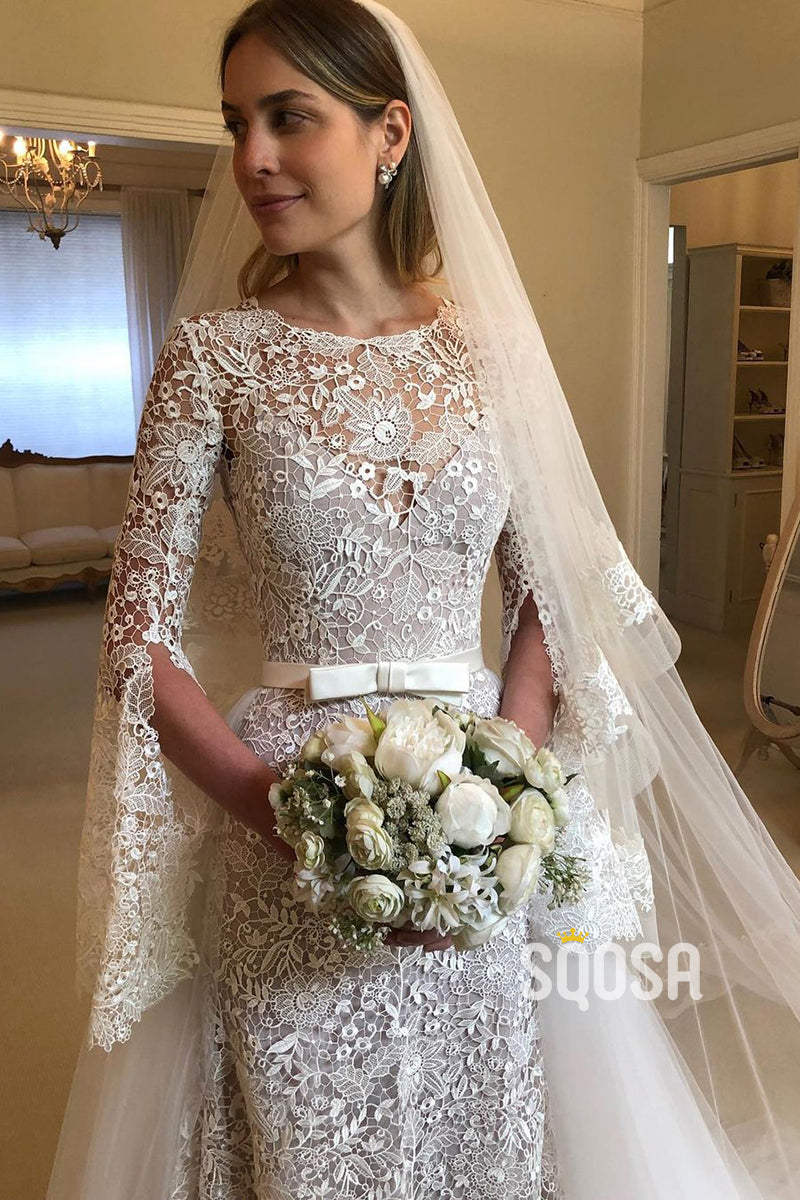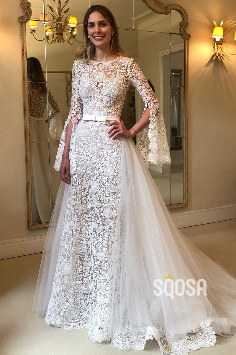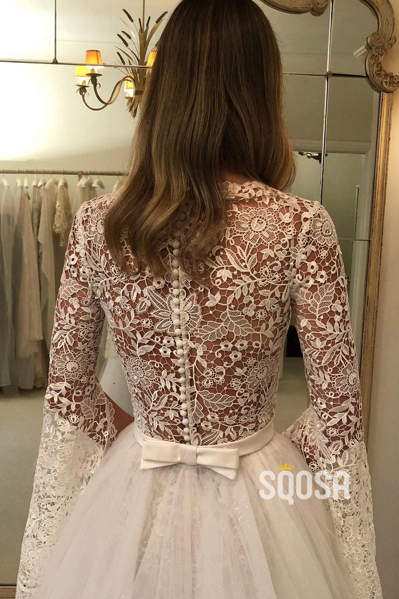 Unique Jewel Romantic Lace Wedding Dress with Sleeves Bridal Gown QW2353