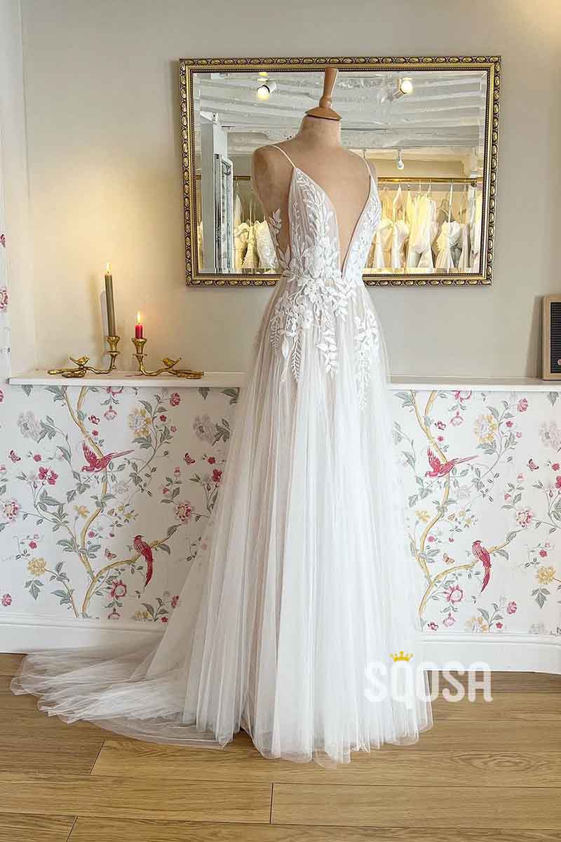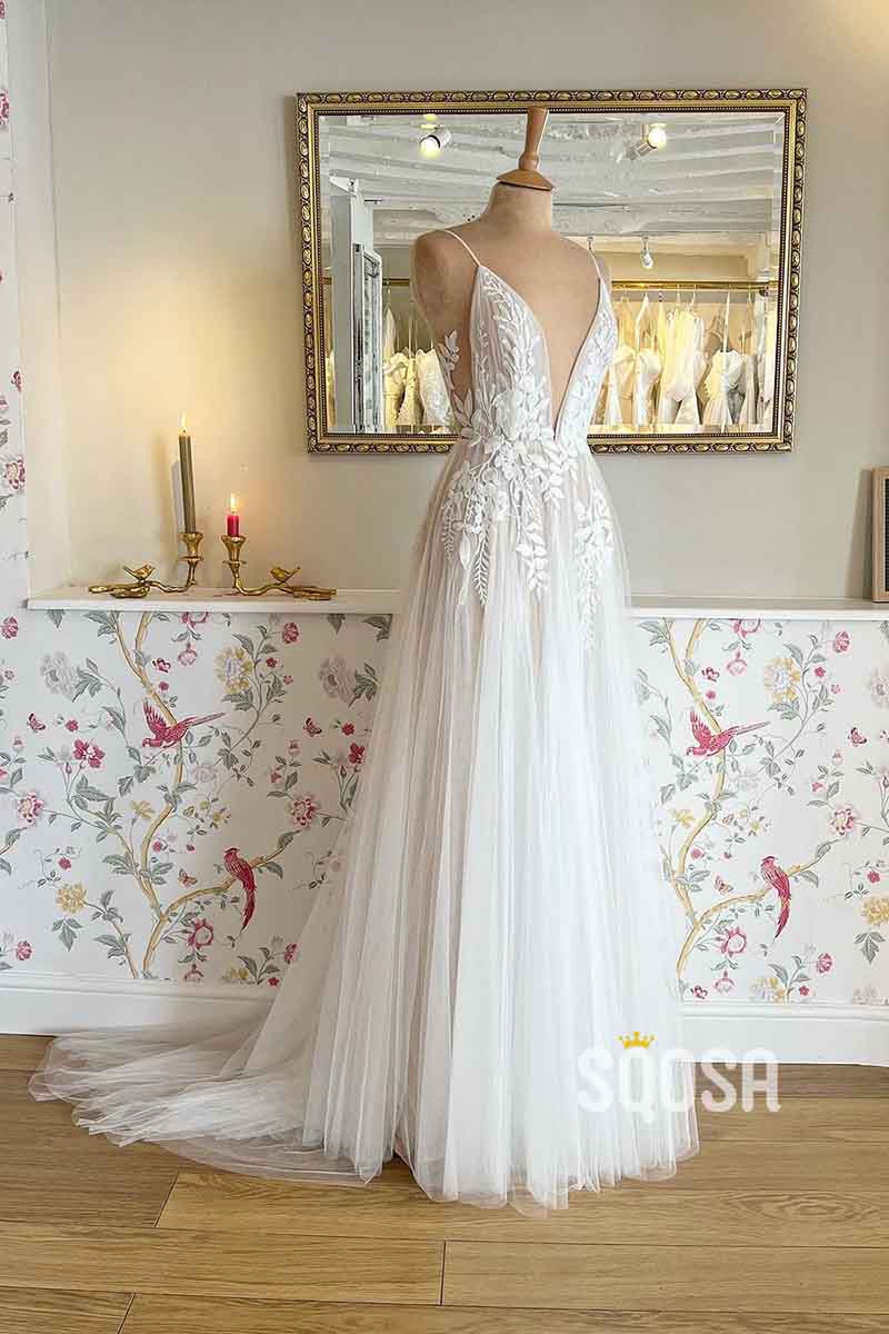 A Line Deep V neck Lace Appliques Elegant Boho Wedding Dress QW2357