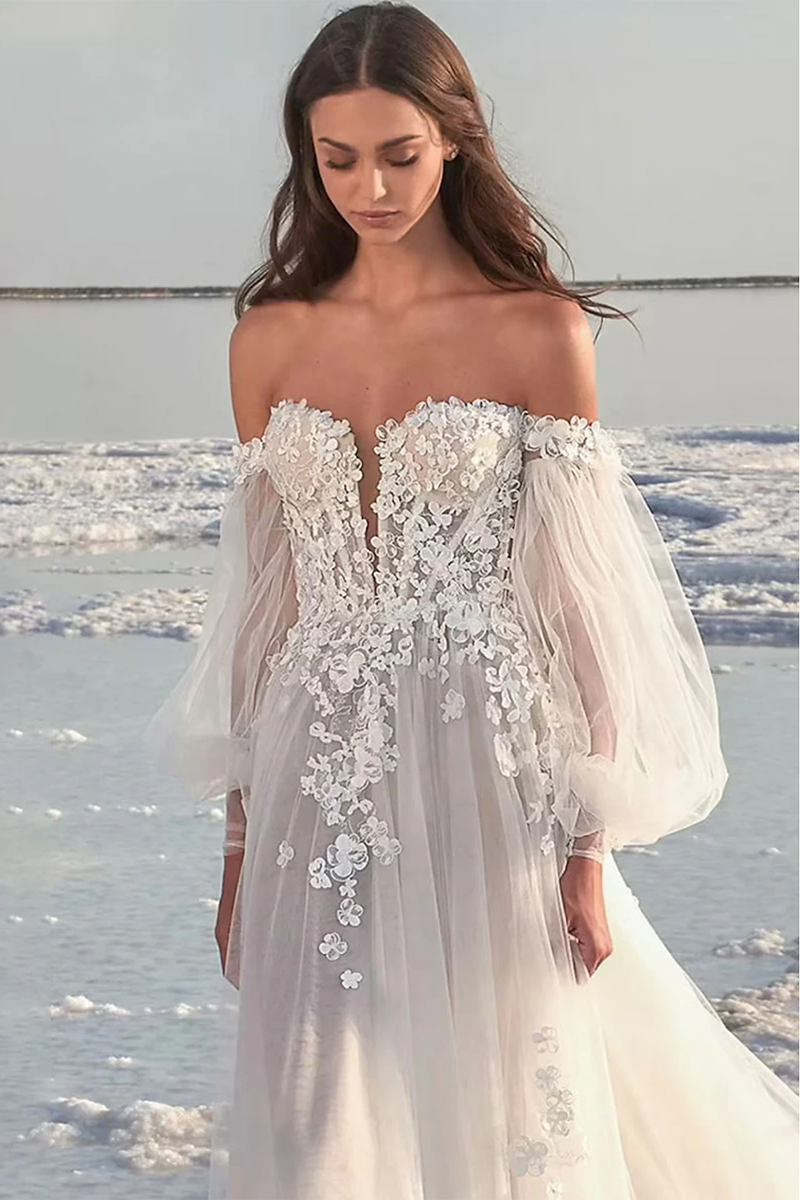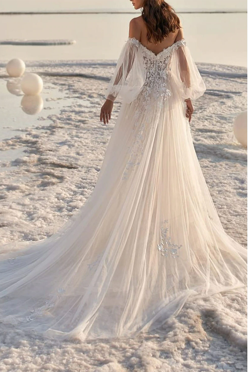 Beach Formal Wedding Dresses Court Train A-Line Lace Appliques Long Sleeves Summer Bridal Gown