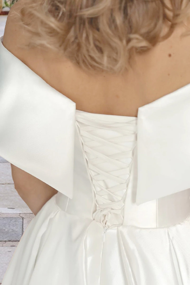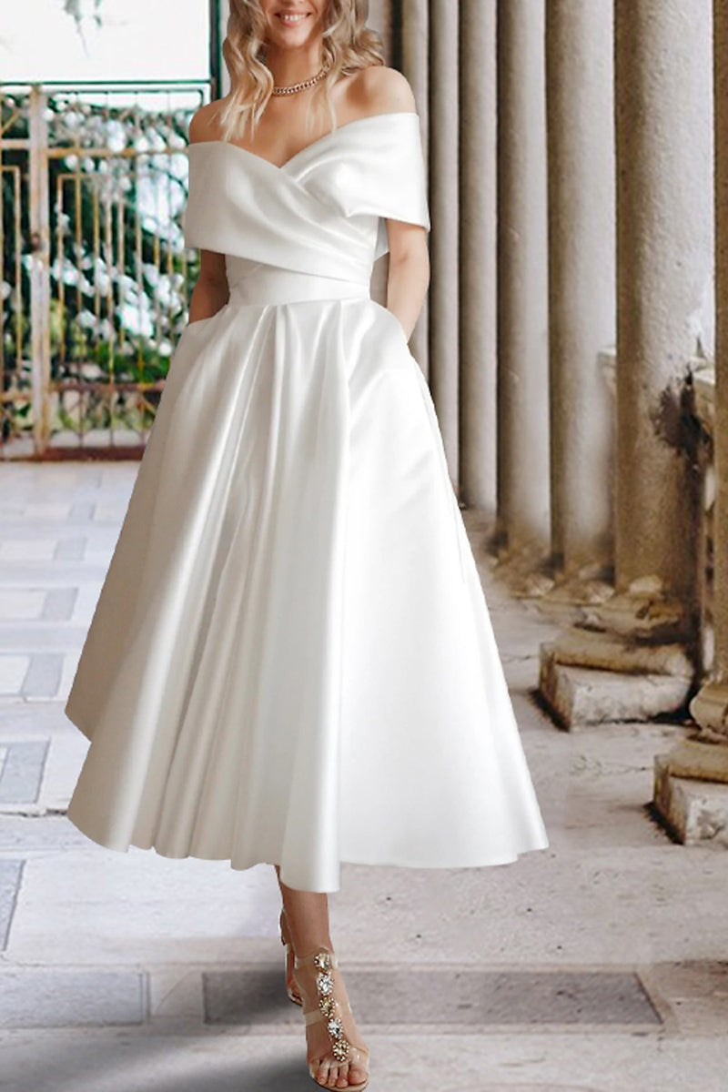 Bridal Shower Little White Wedding Dress Off the Shoulder Tea Length Satin Bridal Gown QW2382