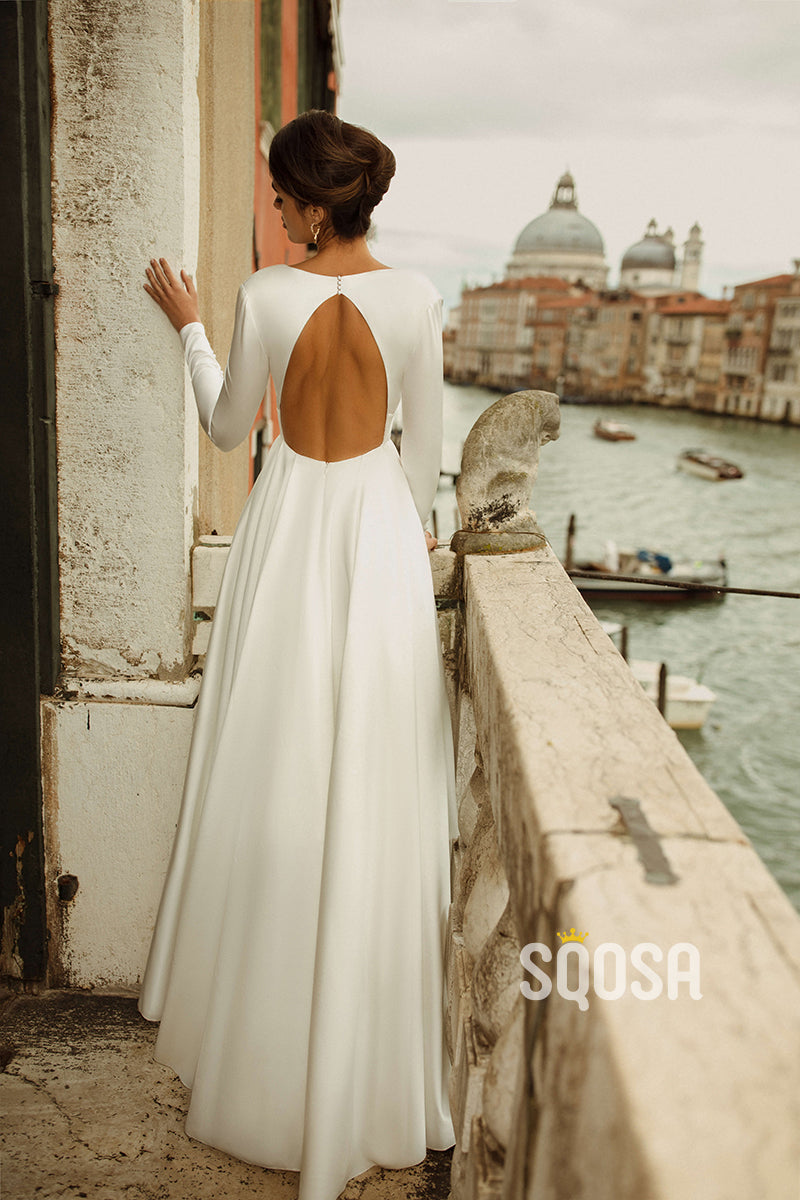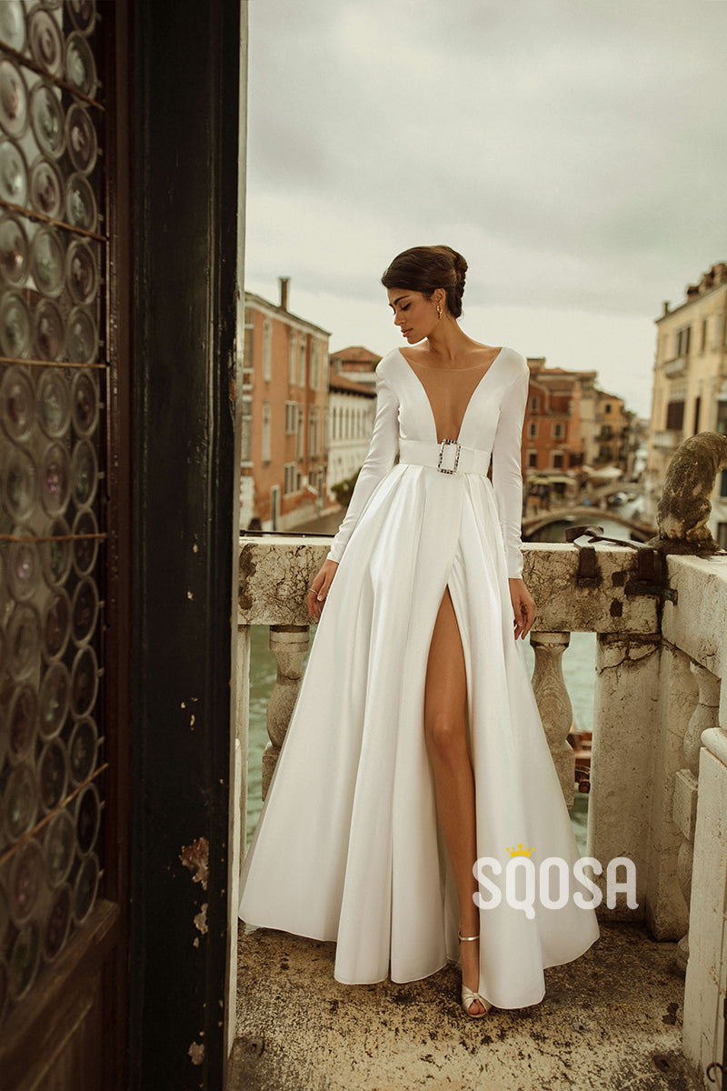 A Line Illusion Deep V neck Long Sleeves Elegant Satin Wedding Dress with Slit QW2401