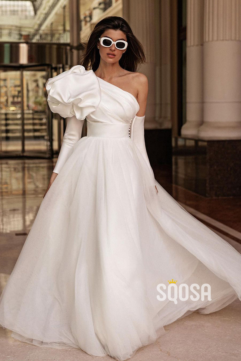 A Line One Shoulder Long Sleeves Satin Elegant Wedding Dress QW2404