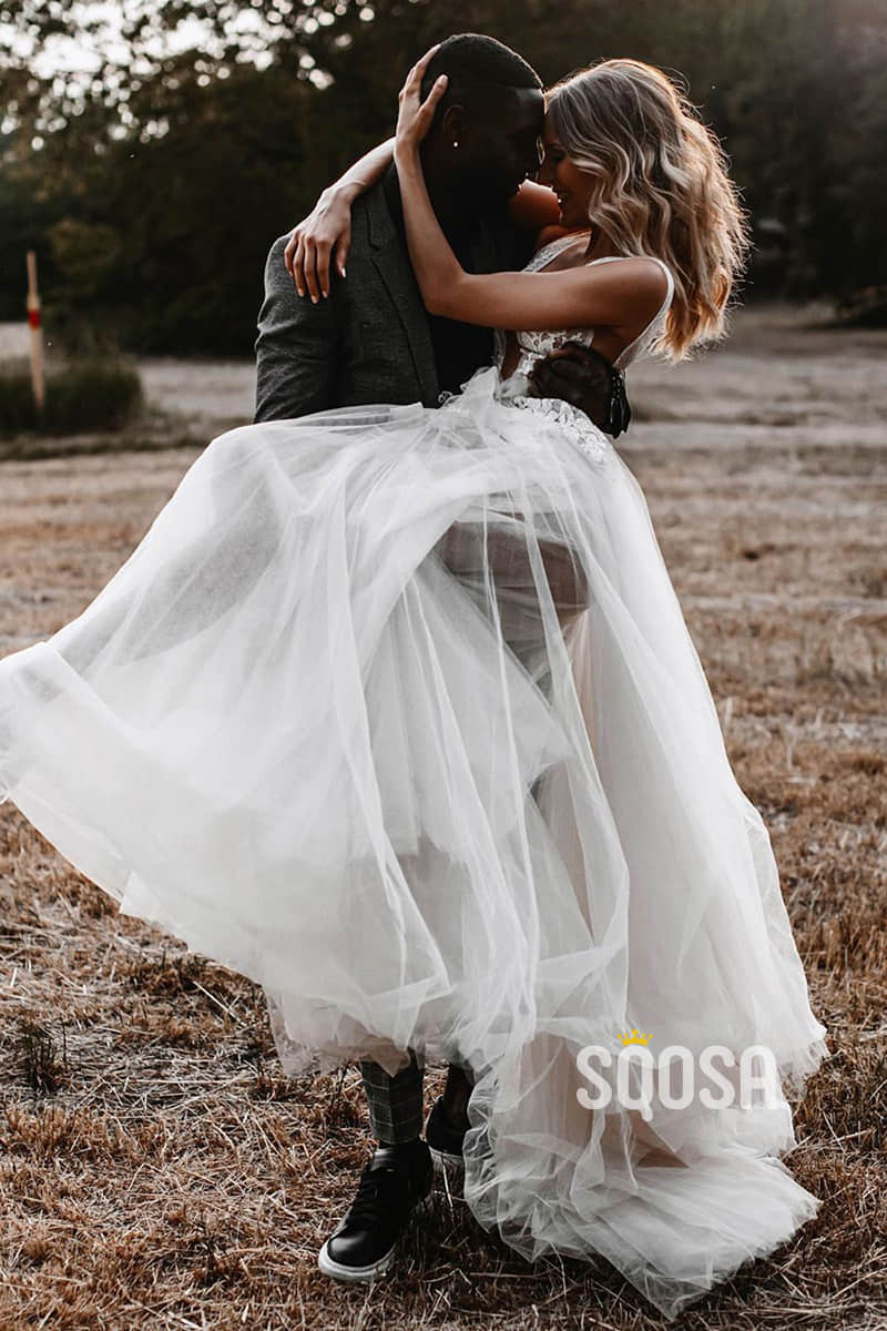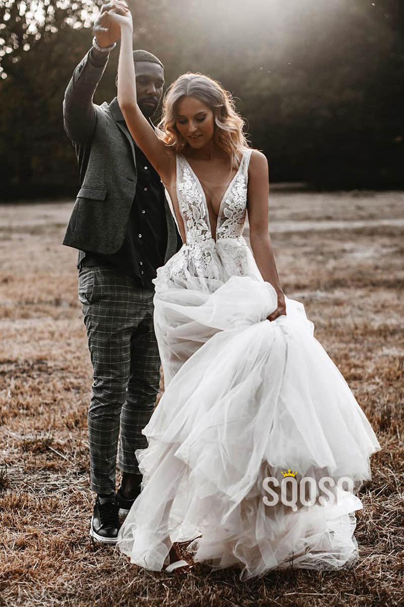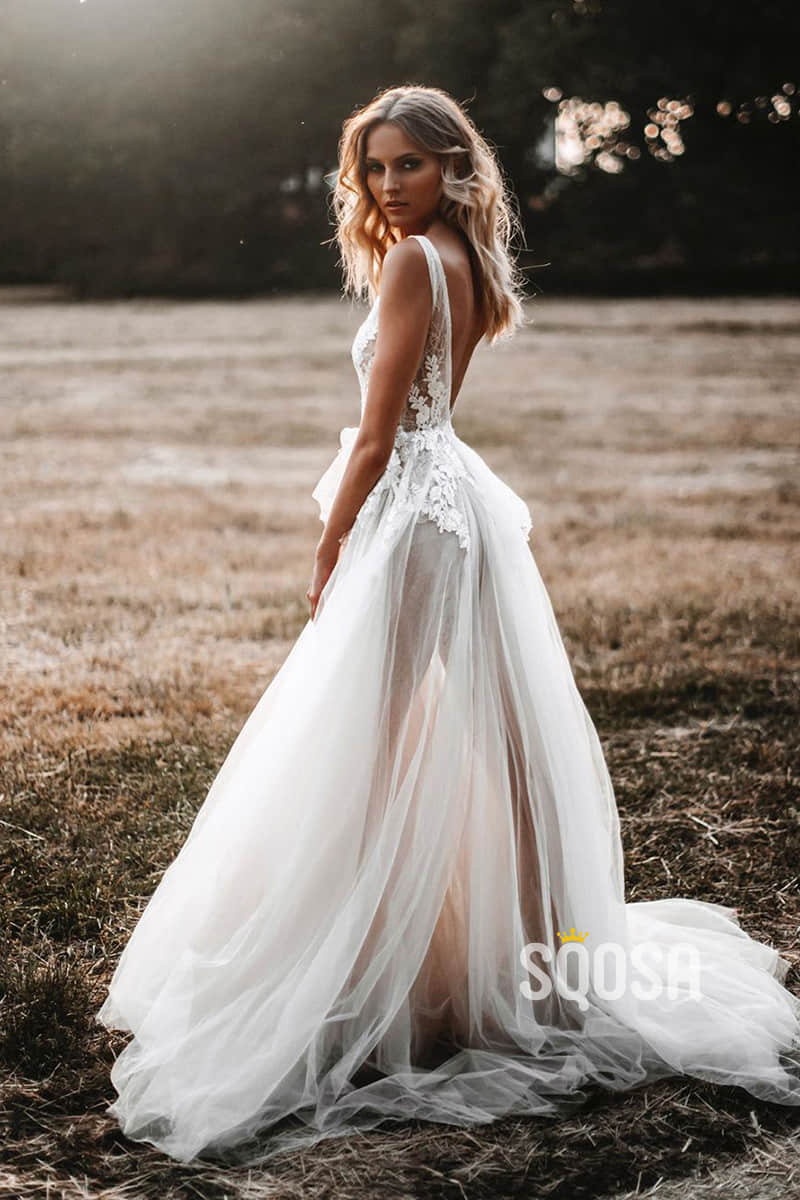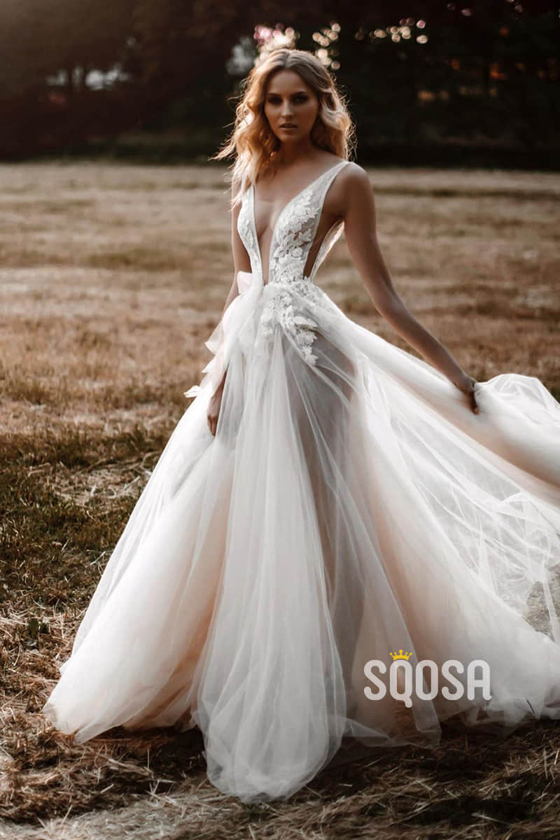 Attractive V-neck Chic Appliques Bohemian Wedding Dress QW2414