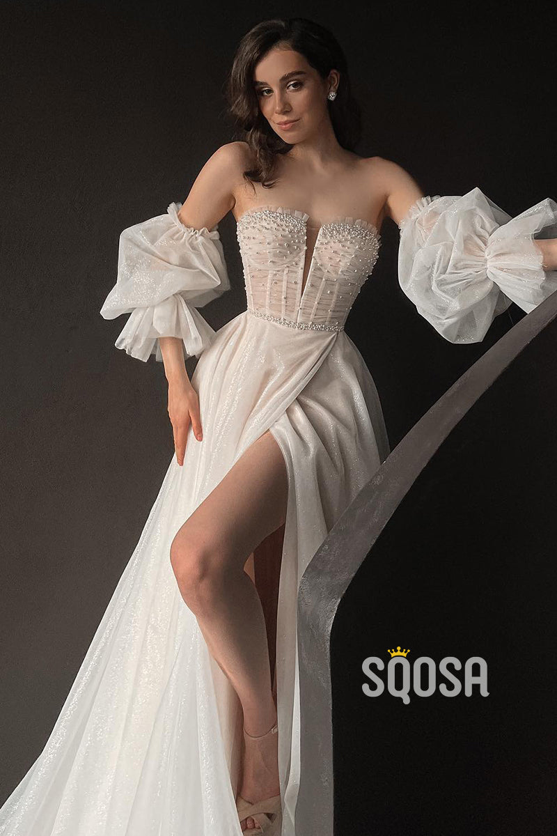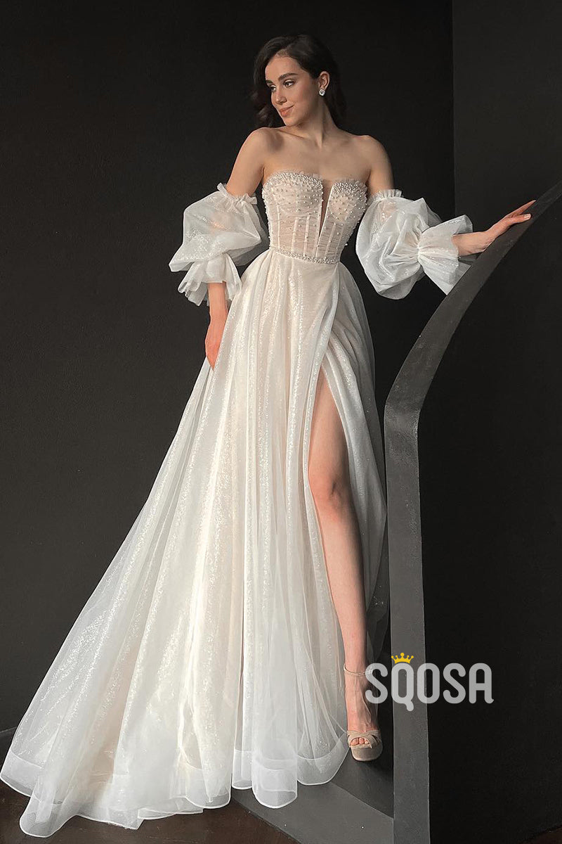 Plunging V-Neck Pearls Short Sleeves A-line Rustic Wedding Dress QW2415