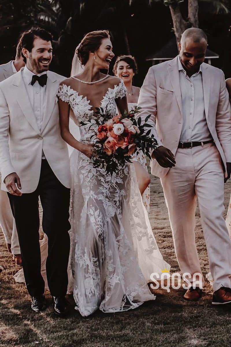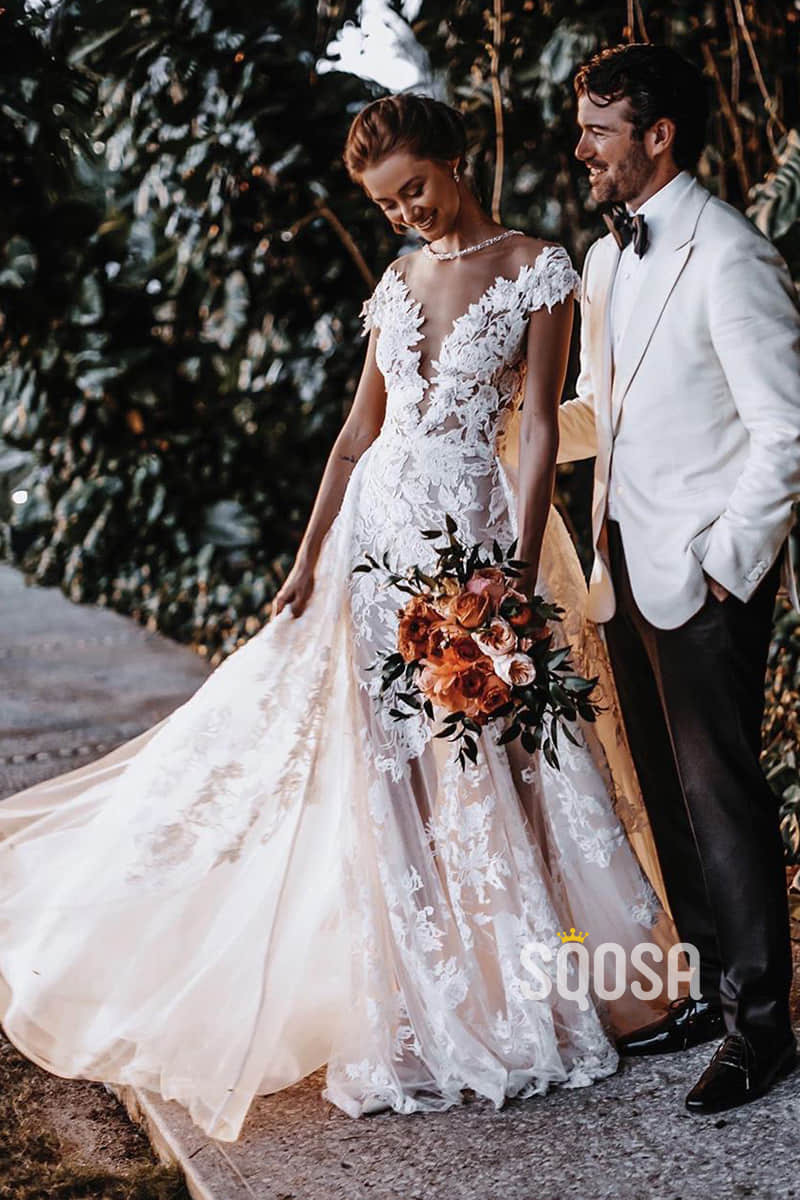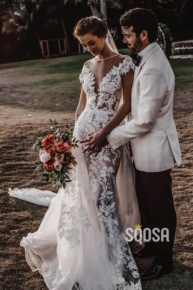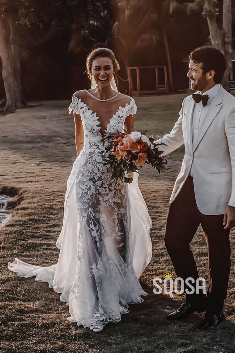 Chic Illusion Neckline Appliques Mermaid Bohemian Wedding Dress QW2419