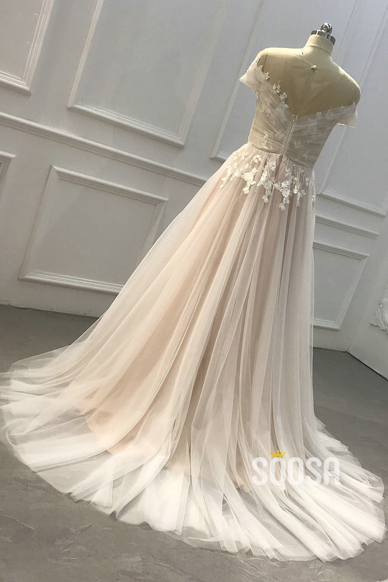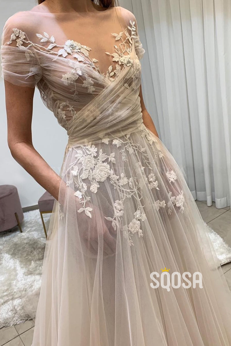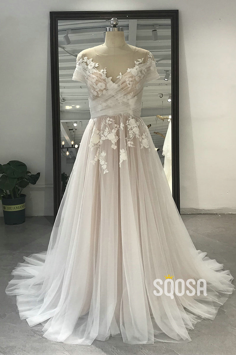 A-line Chic Illusion Neckline Appliques Country Wedding Dress with Sleeves QW2449