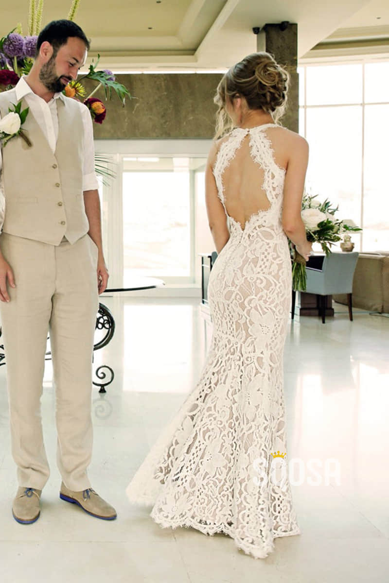 Unique Bateau Neckline Lace Mermaid Wedding Dress