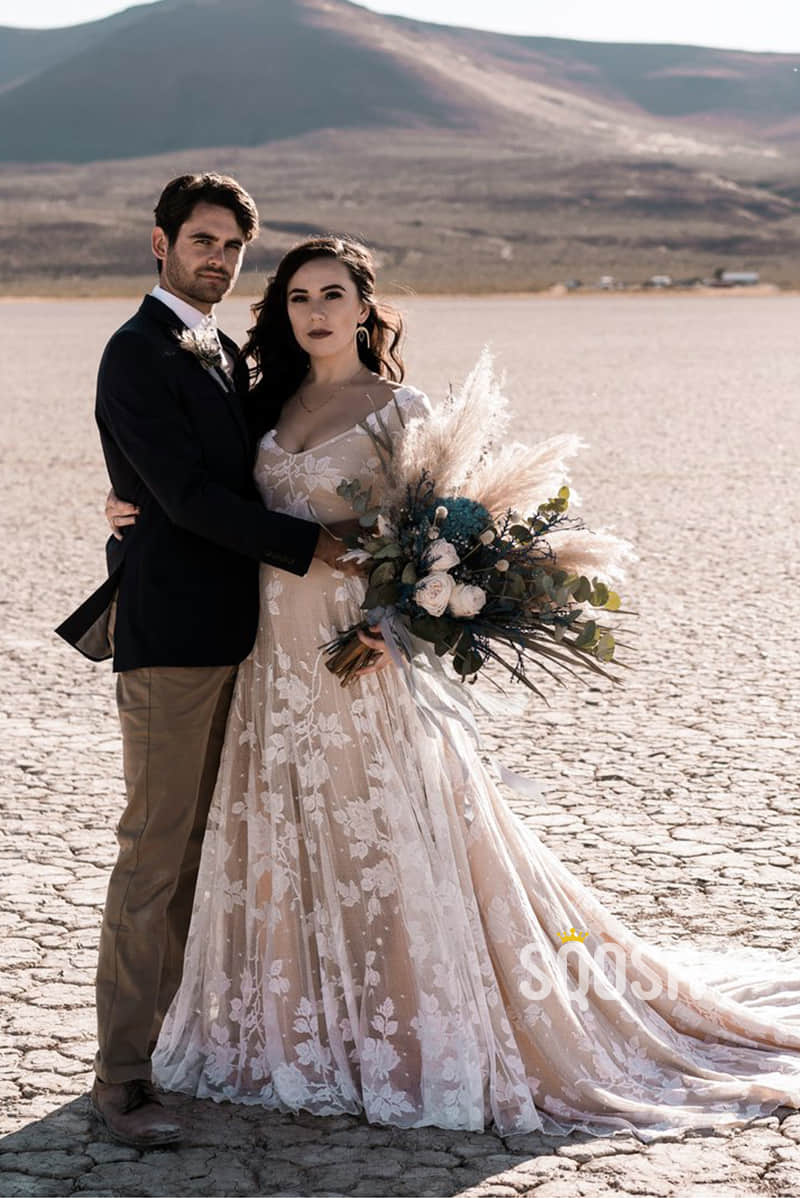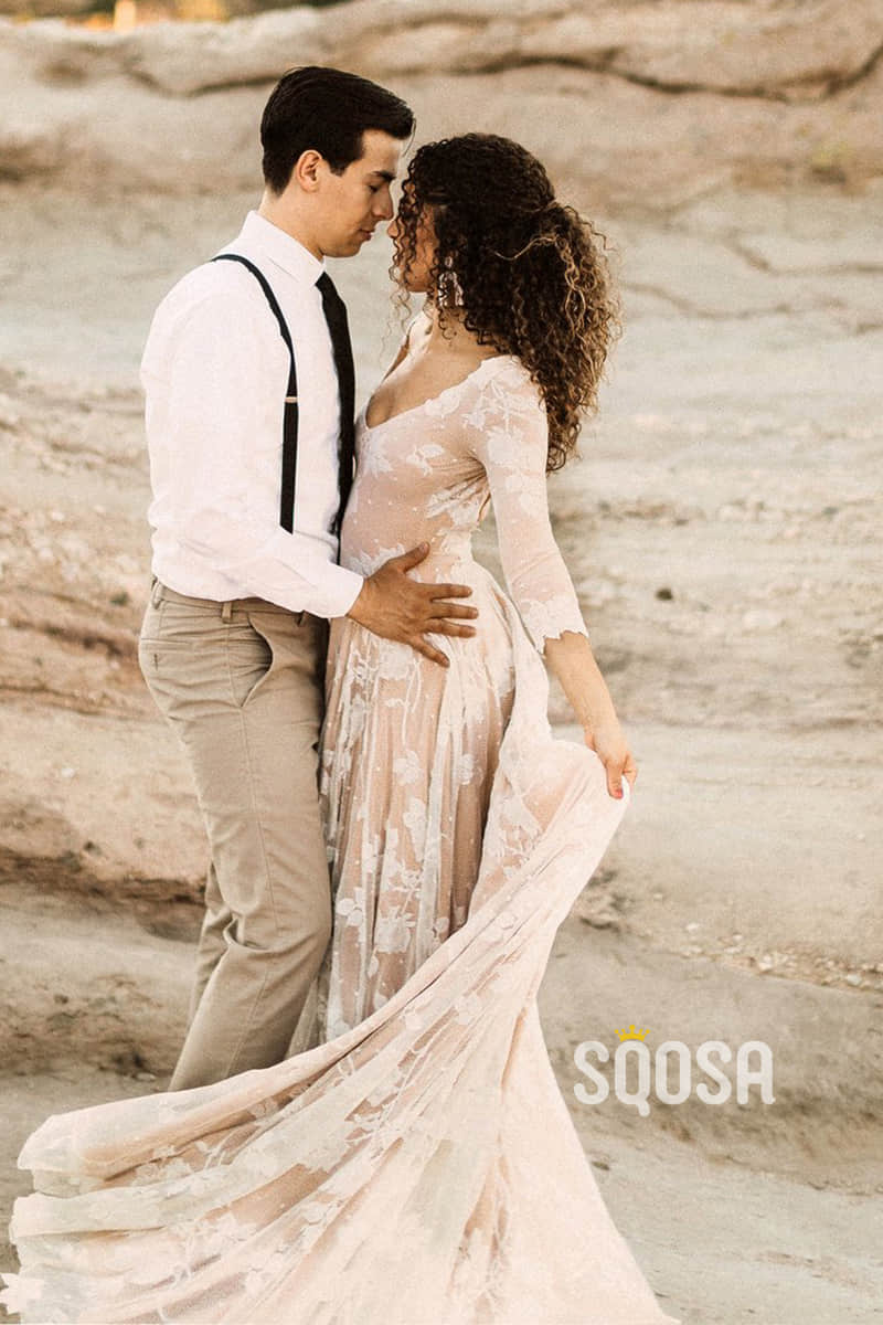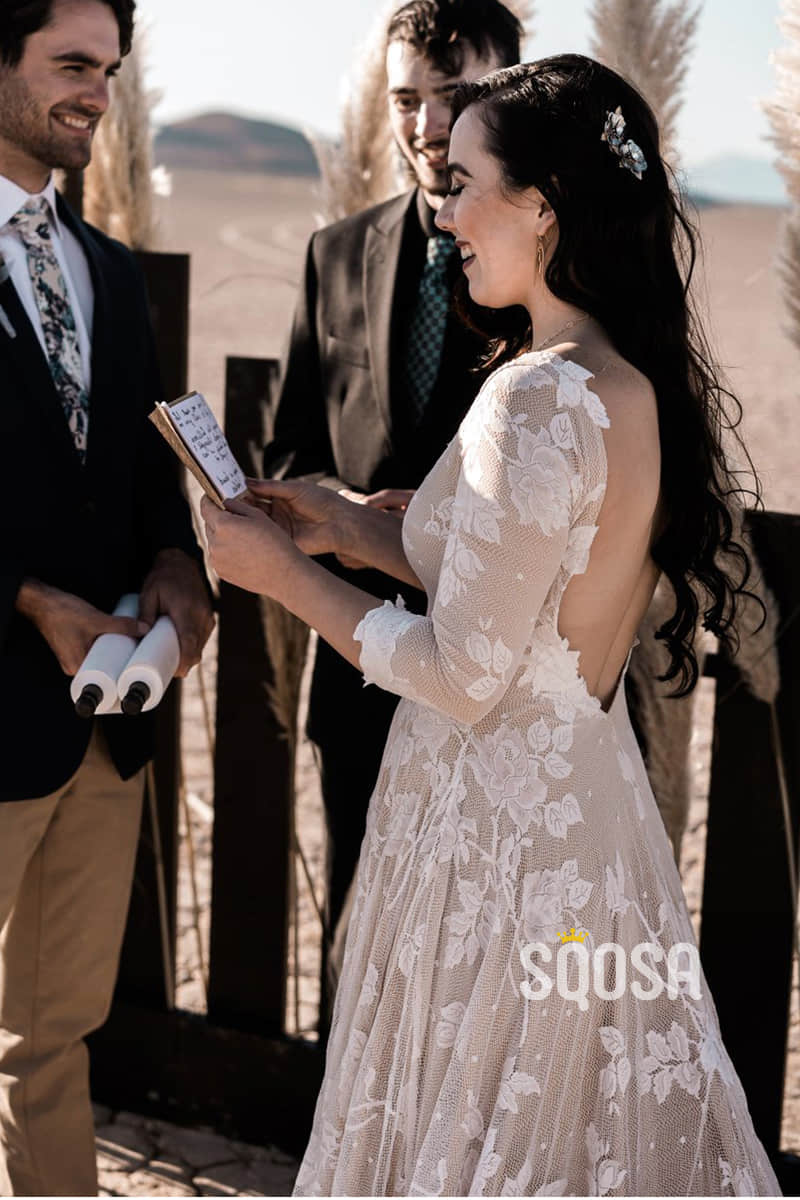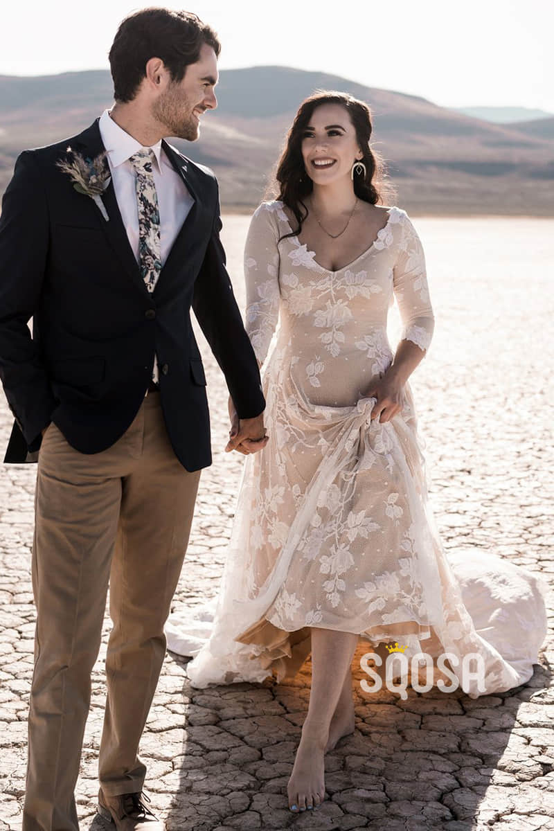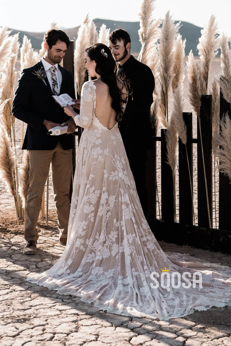 Exquisite Champagne Lace Appliques 3/4 Sleeves Bohemian Wedding Dress QW2472