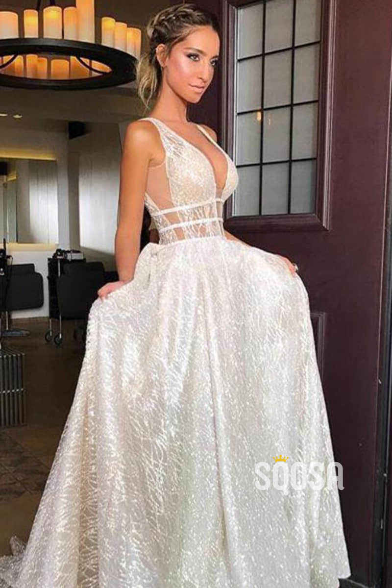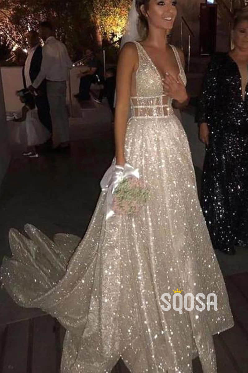 Attractive V-neck Sparkly A-line Wedding Dress QW2479