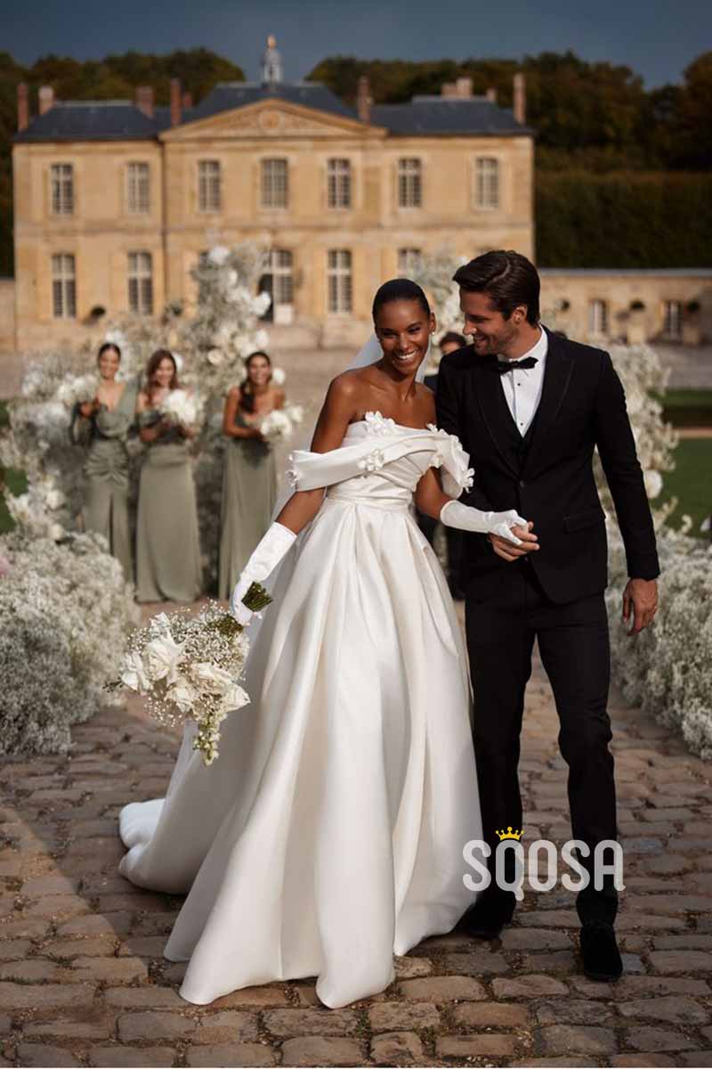 A Line Strapless Satin Pleats Elegant Wedding Dress