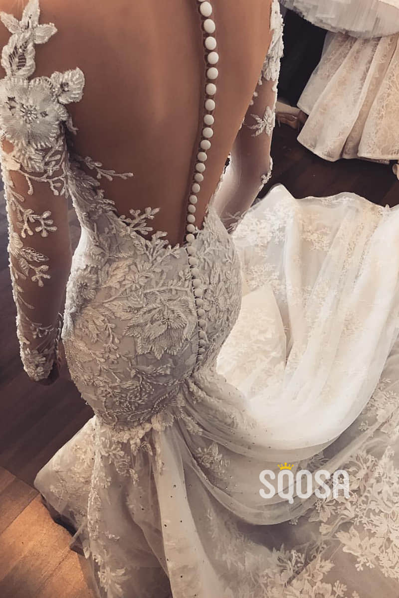 Unique Illusion Neckline Long Sleeves Luxury Lace Wedding Dress Mermaid Gown QW2506