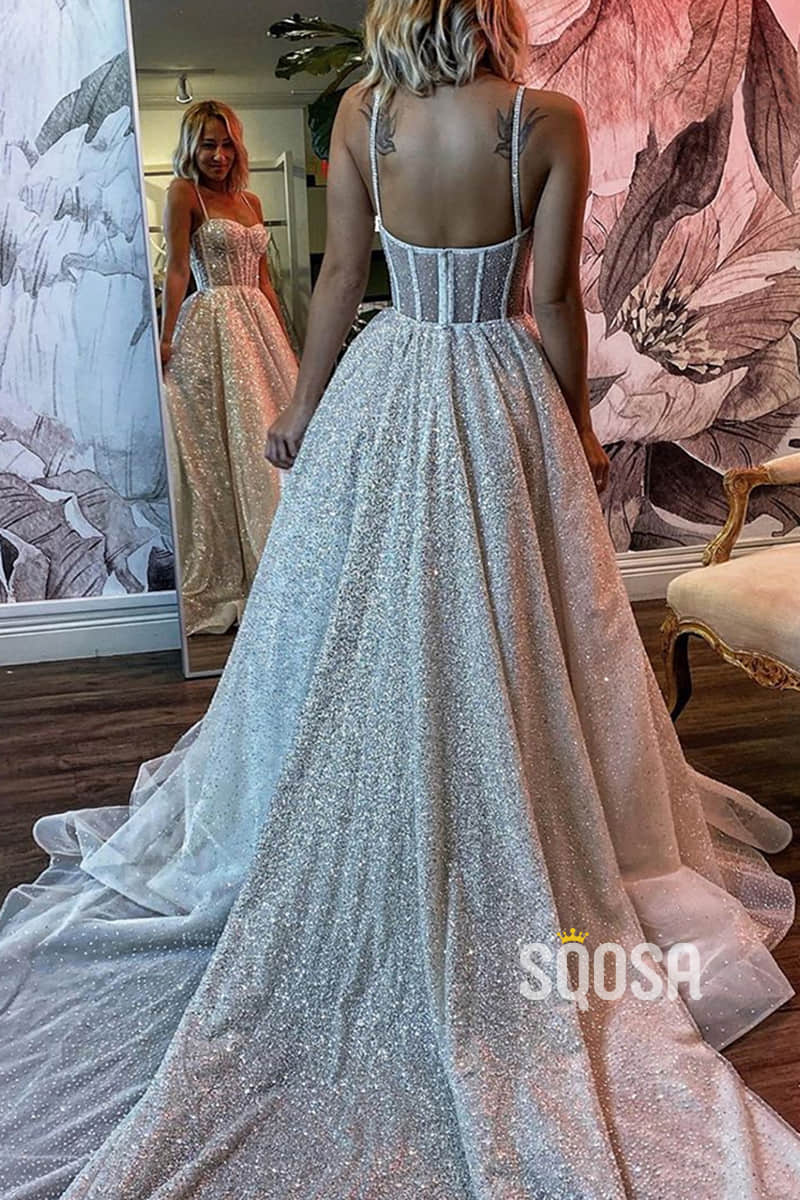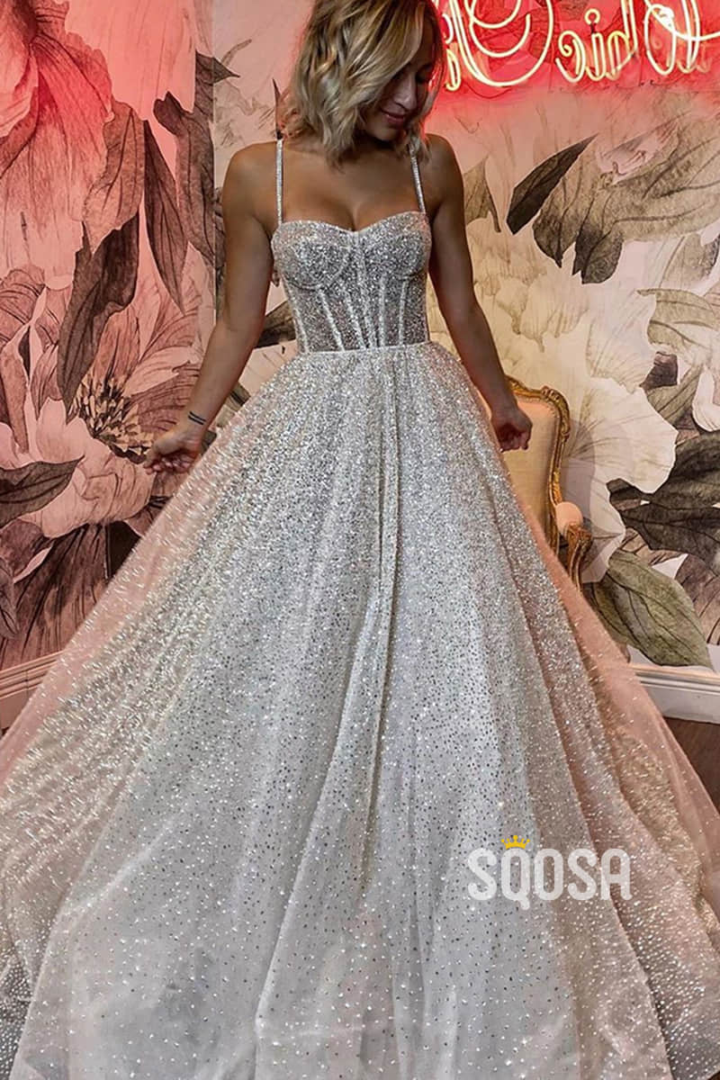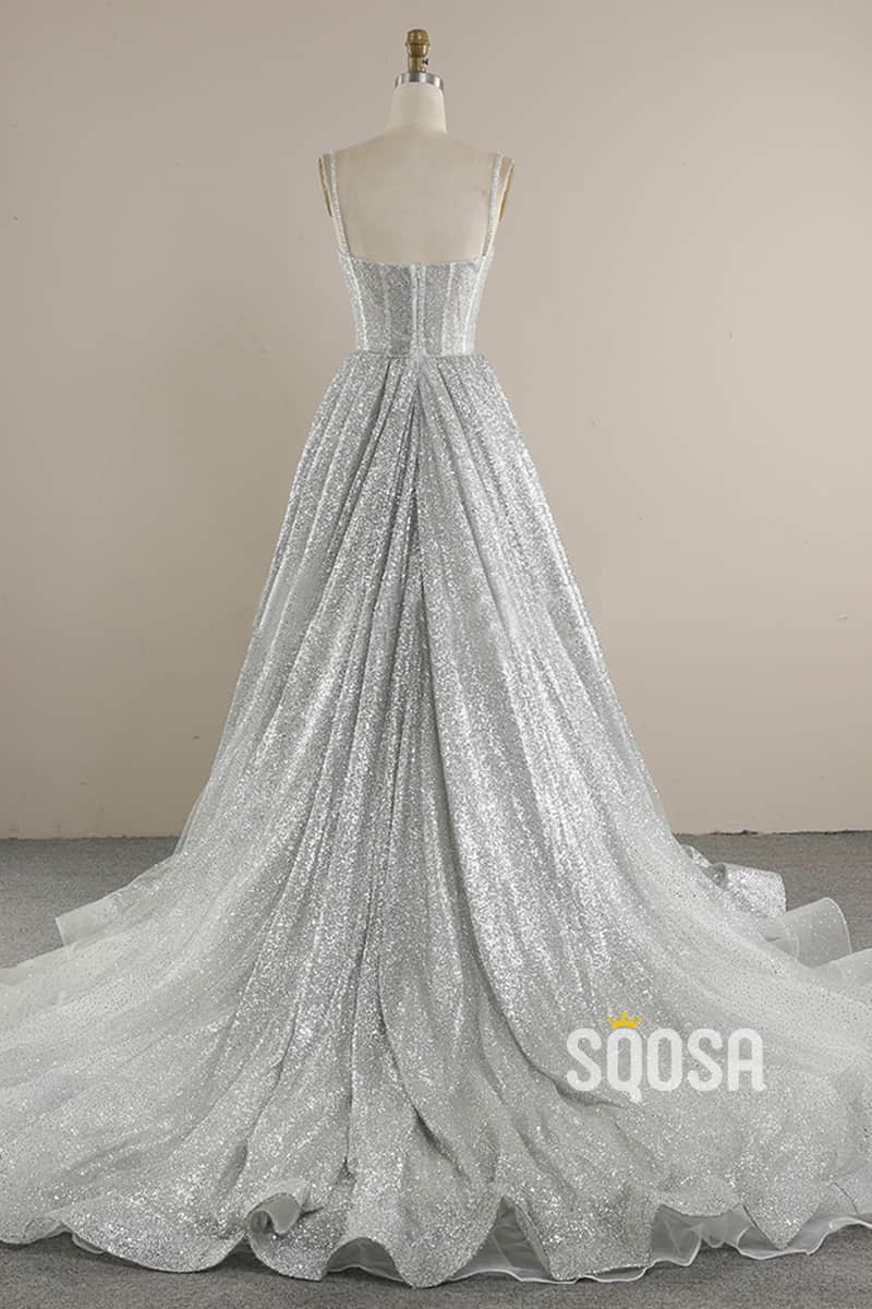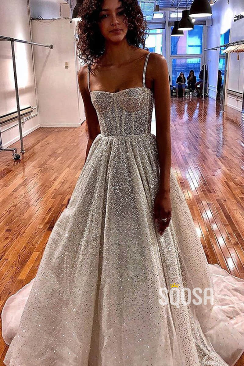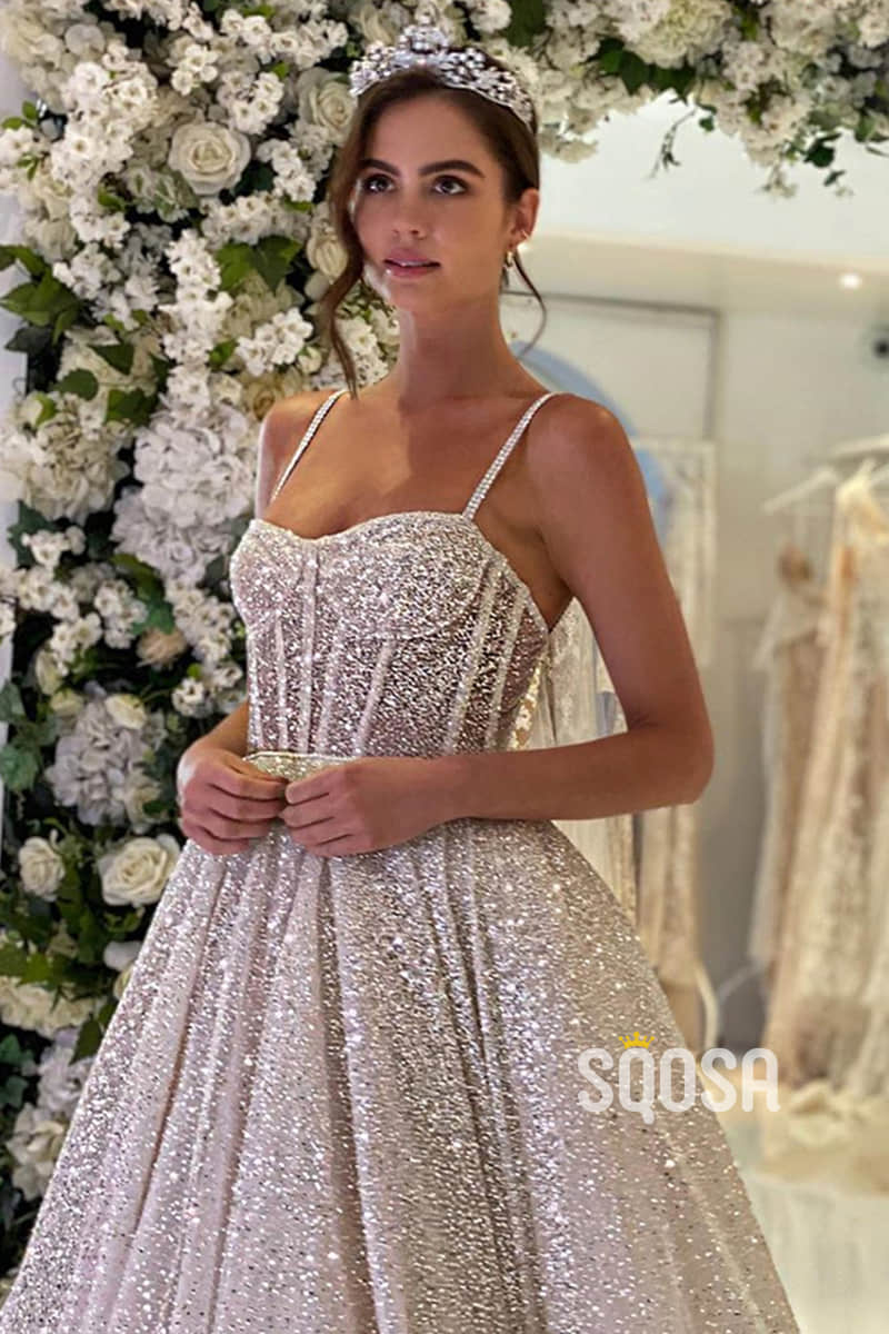 Spaghetti Straps Sequins A-line Sparkly Wedding Dress Bridal Gown QW2513