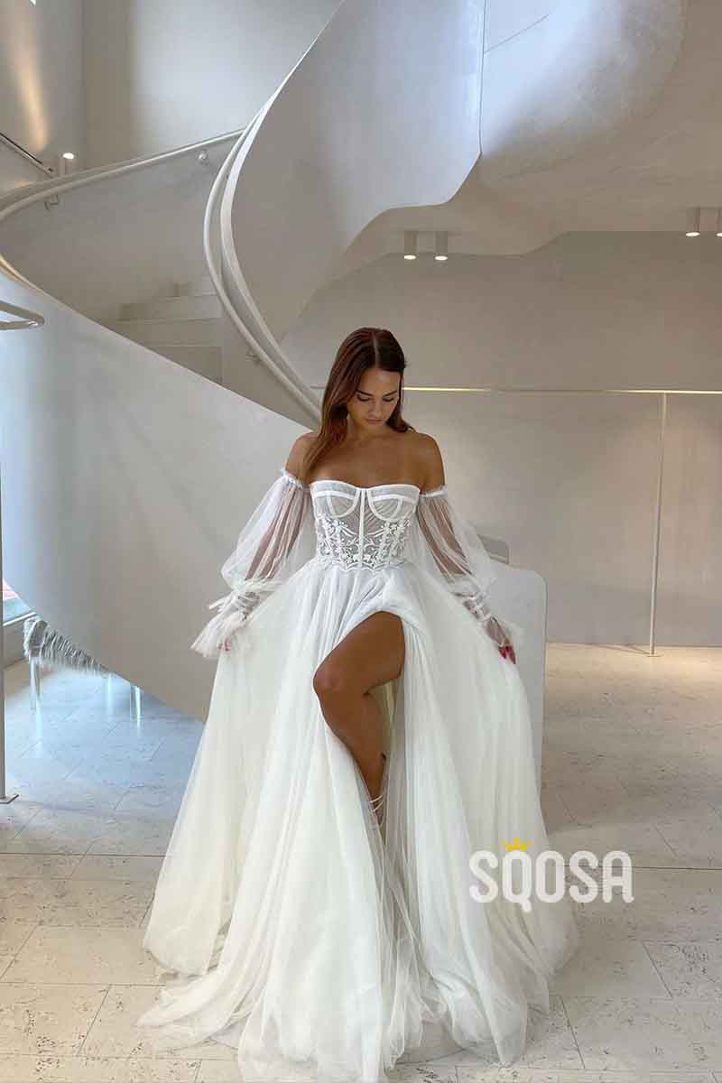 A line Sweetheart Long Sleeves Tulle Elegant Wedding Dress with Slit QW2522