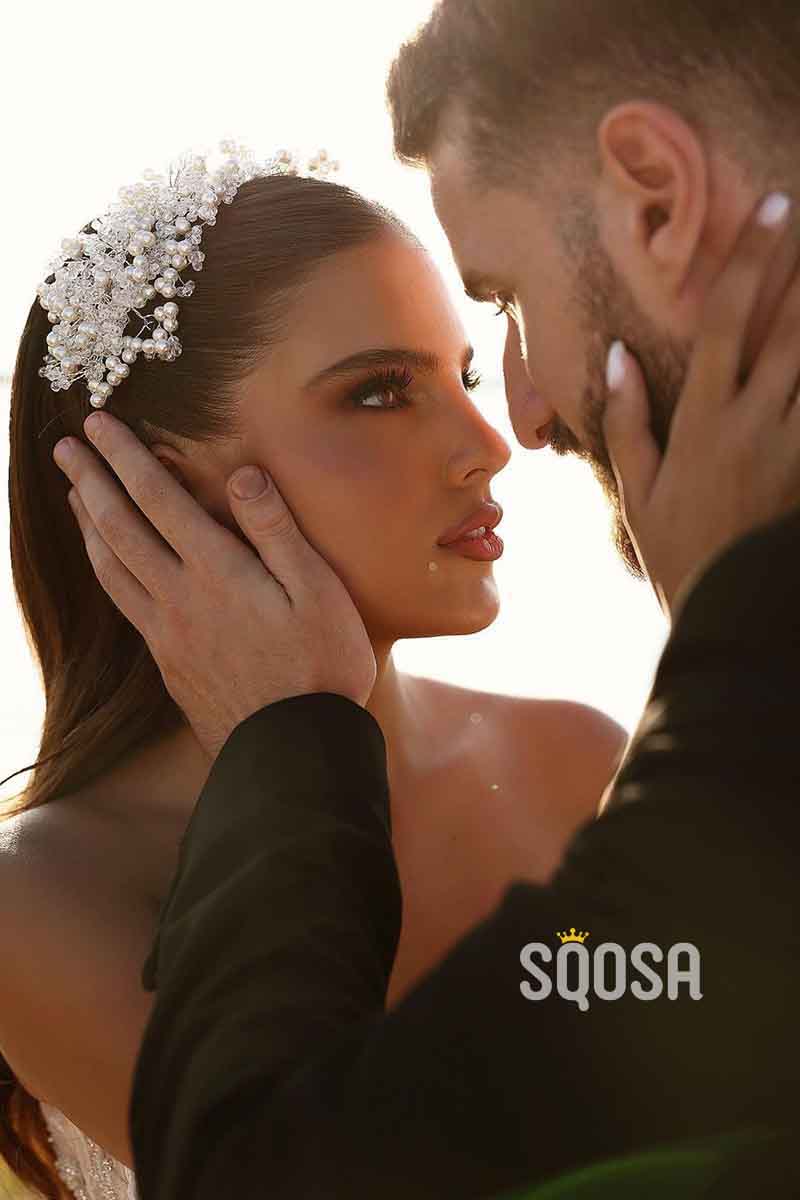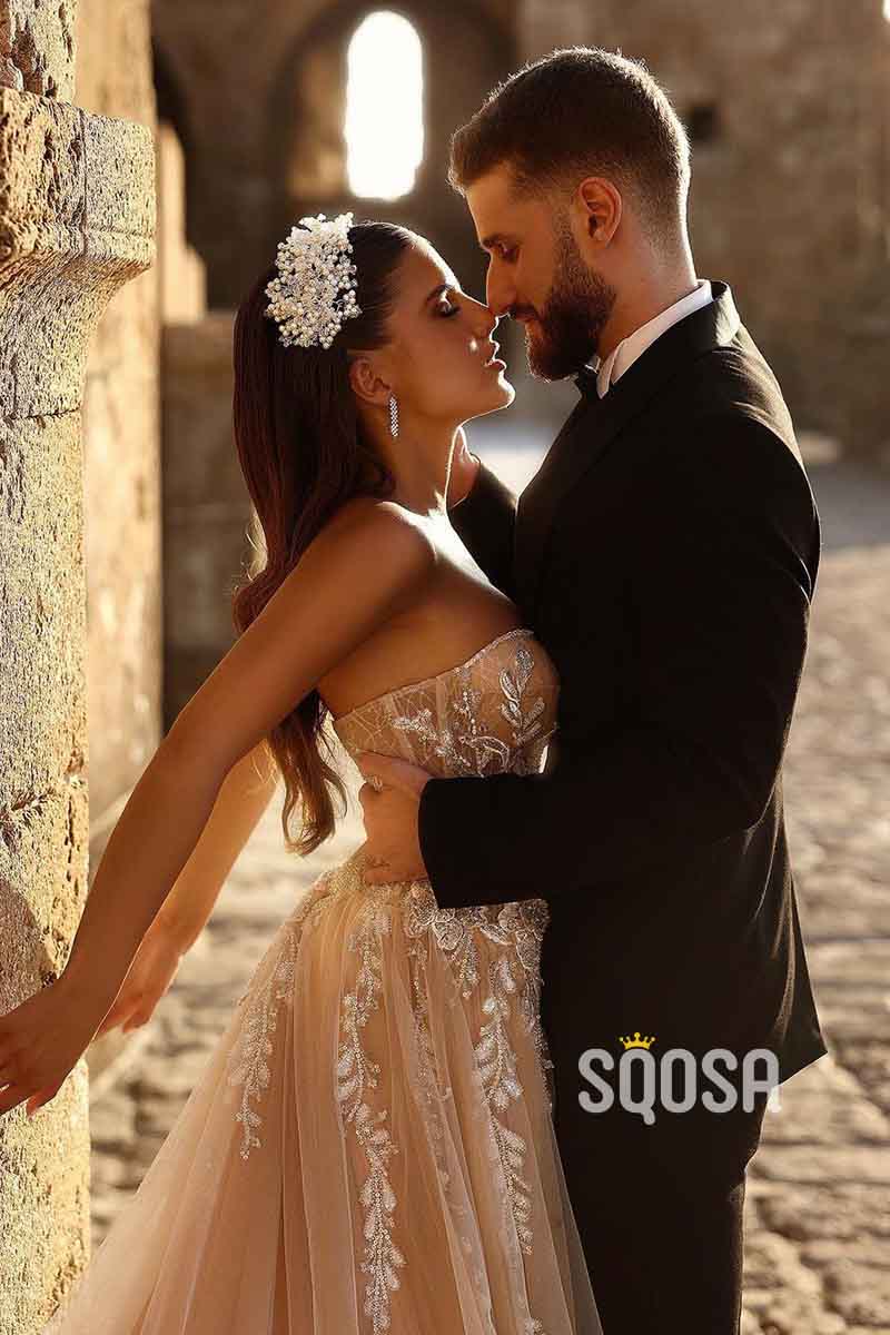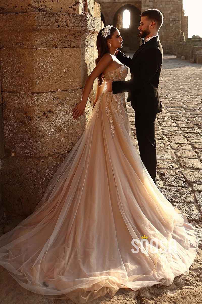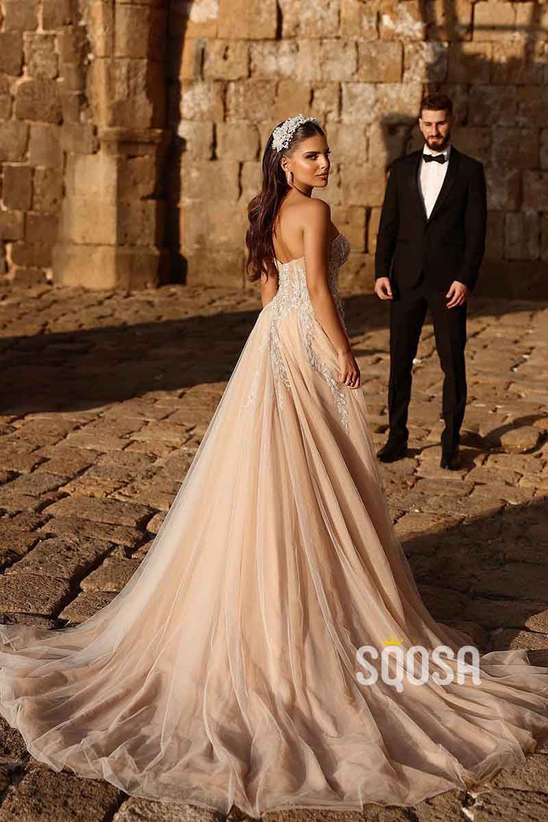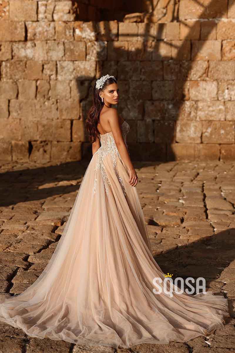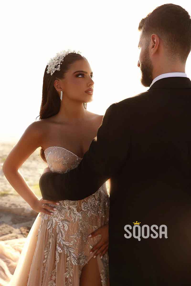 A Line Sweetheart Romantic Lace Appliques Elegant Wedding Dress with Slit QW2525
