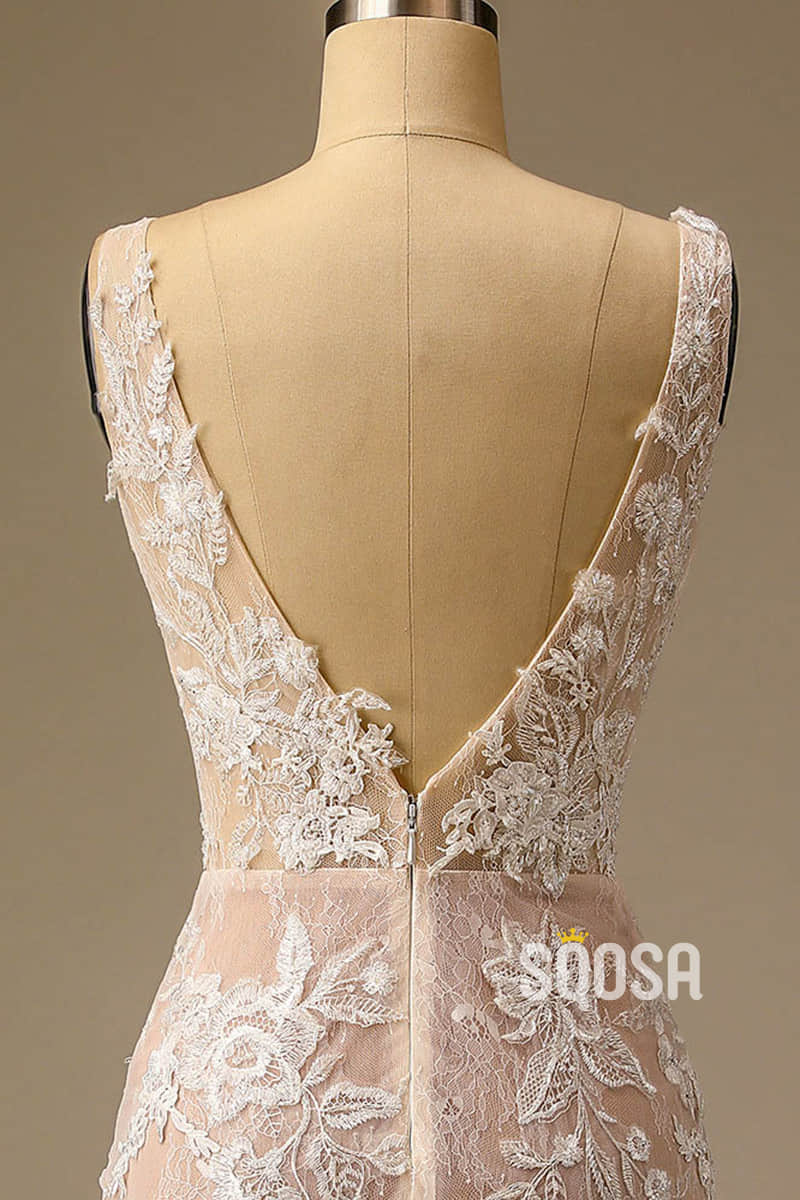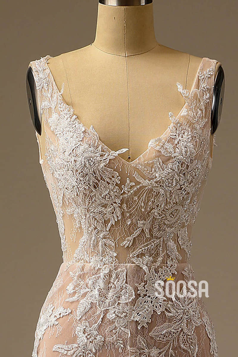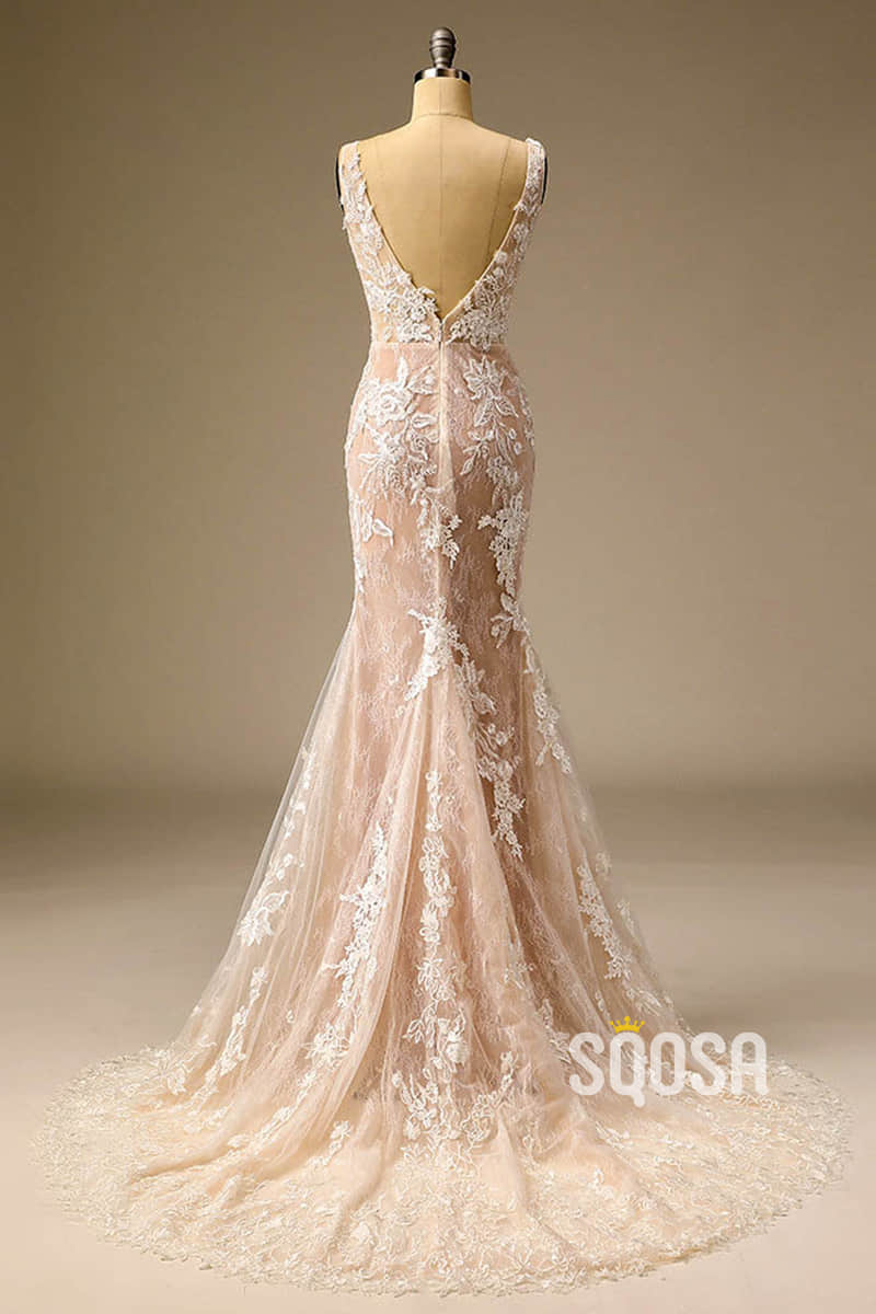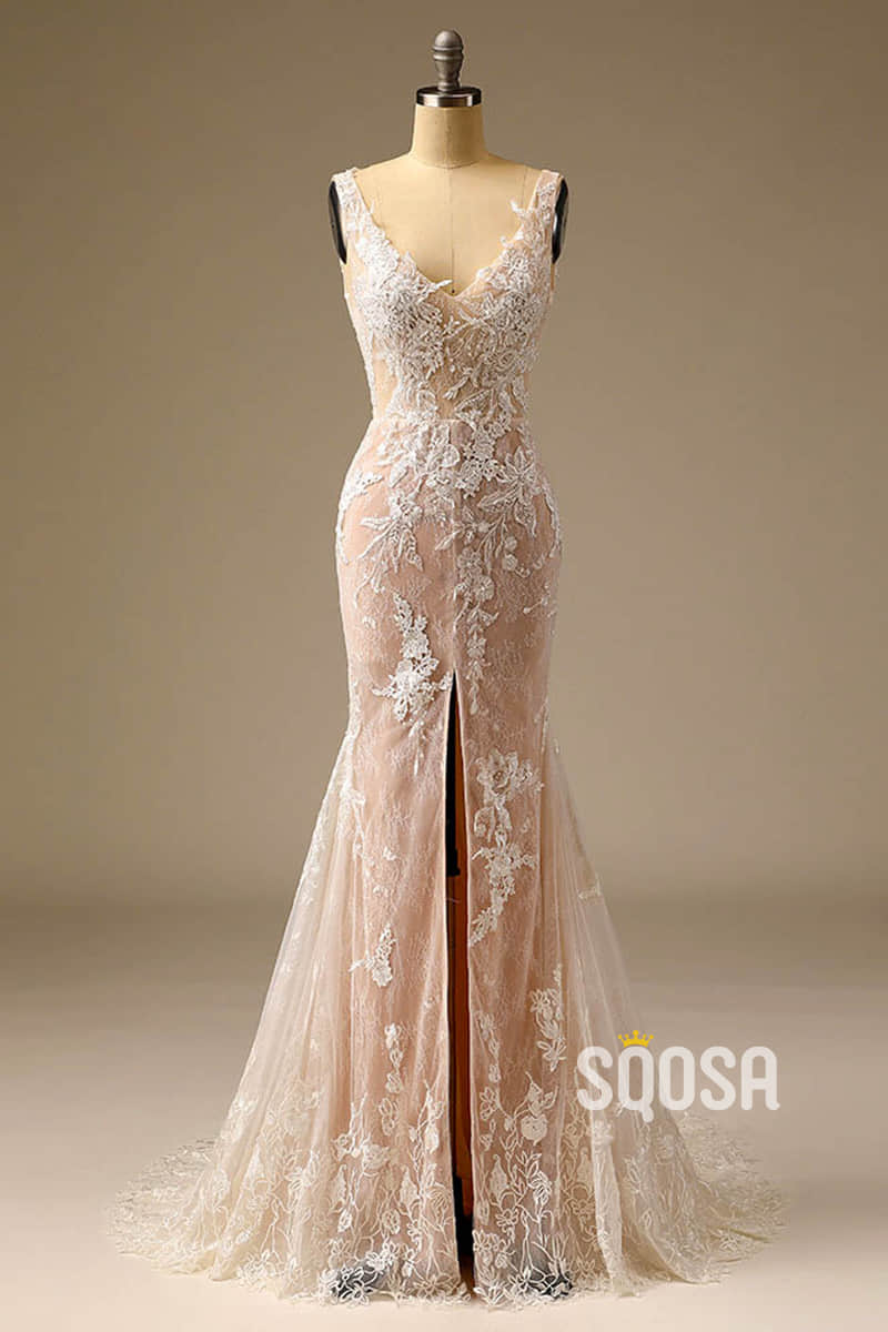 Exquisite Champagne Lace Wedding Dress V-neck Appliques Mermaid Wedding Gown QW2539