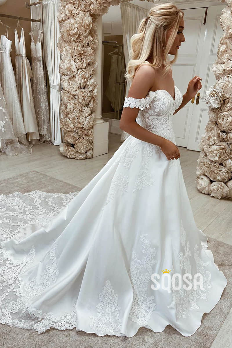 Unique Off-Shoulder Exquisite Lace Appliques A-line Wedding Dress with Court Train QW2557