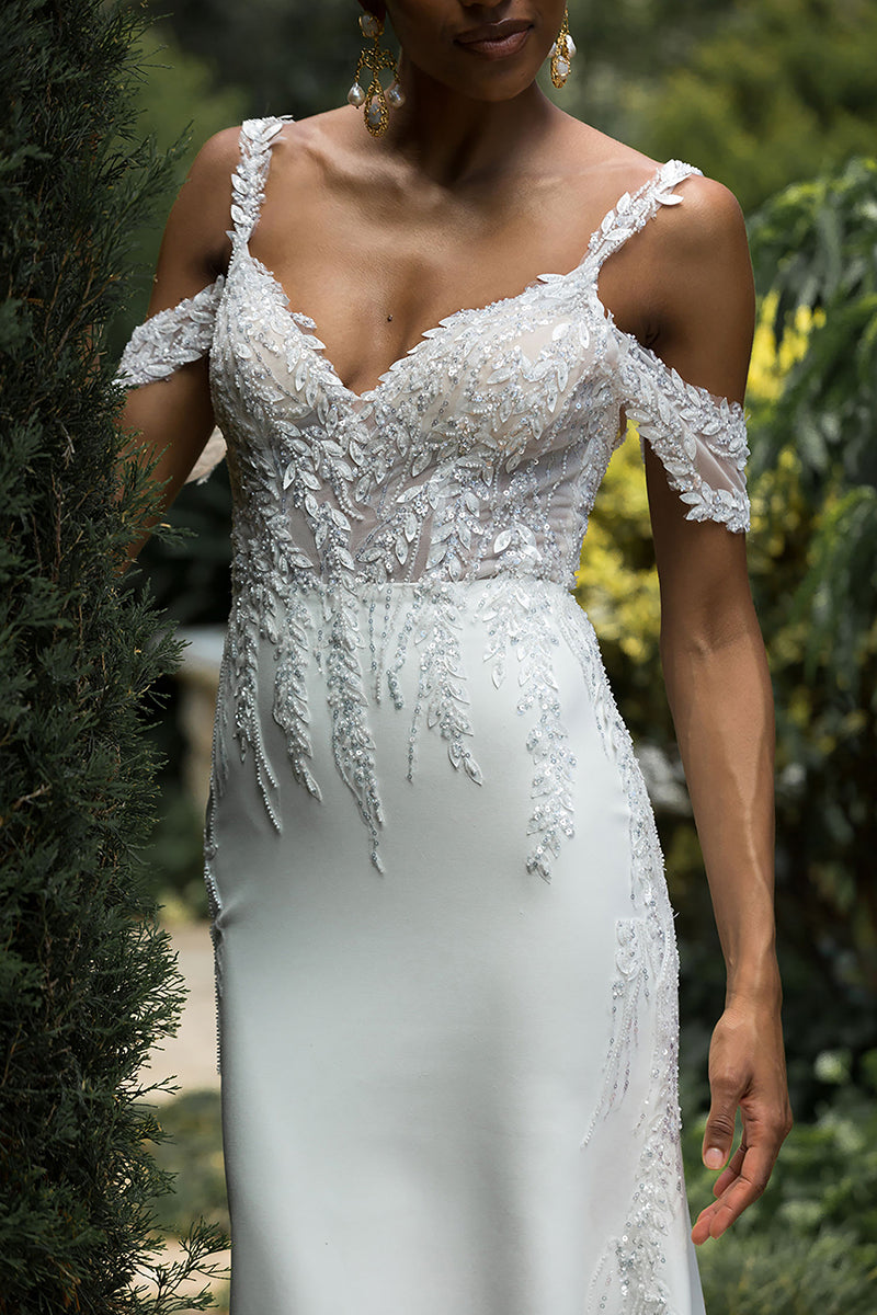 Sexy V Neck Sequins Appliques Mermaid Wedding Dress Open Back Bridal Gown QW2560