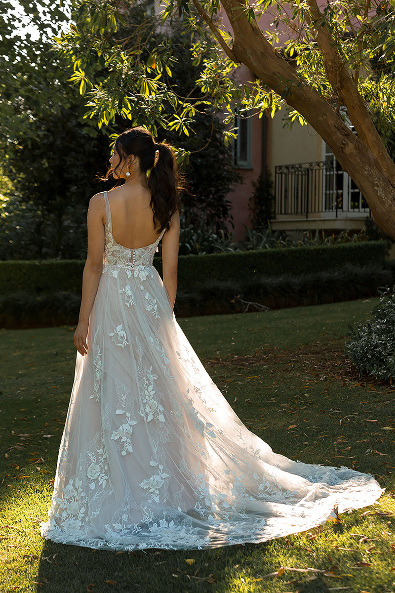 A Line V Neck Lace Appliques Boho Wedding Dress with Sweep Train QW2592 x 1;