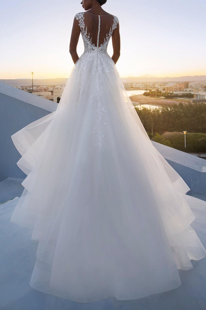 A Line Illusion Neckline Lace Appliques Rustic Wedding Dress