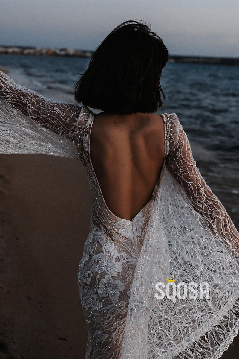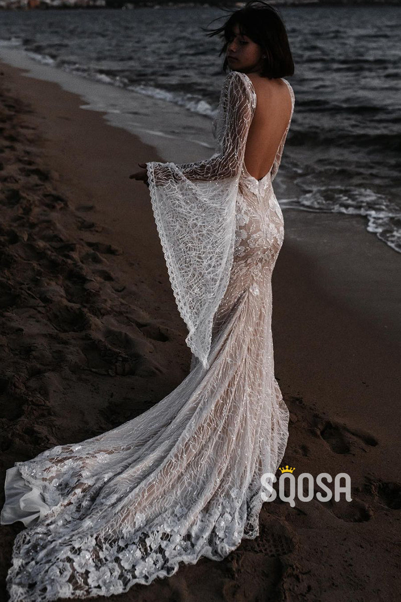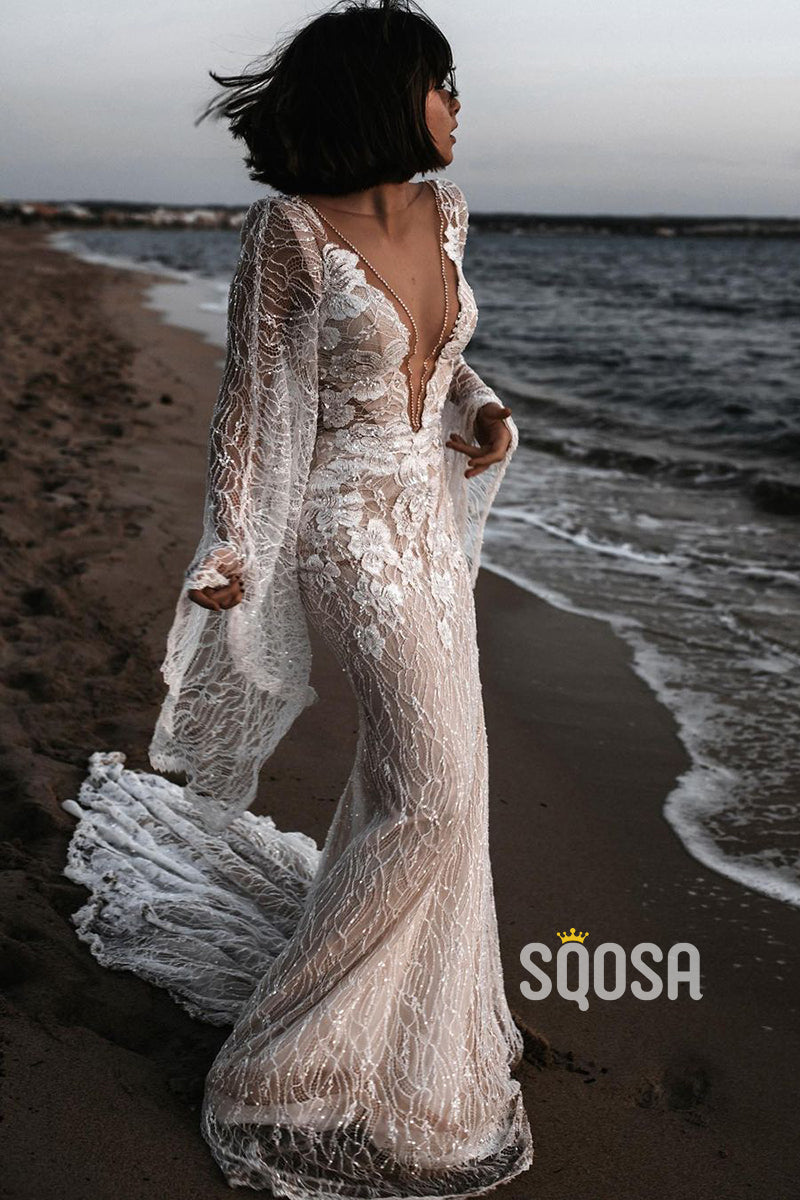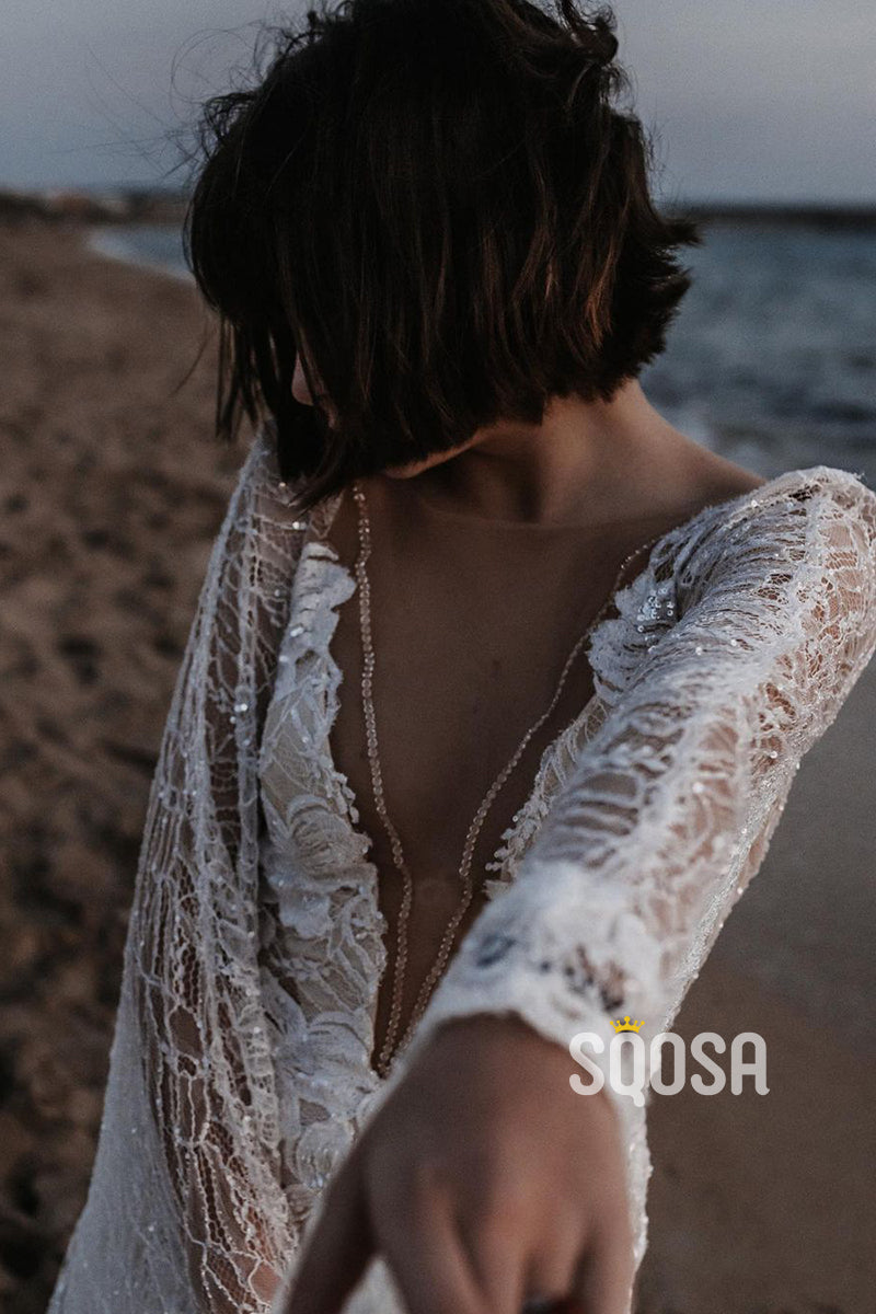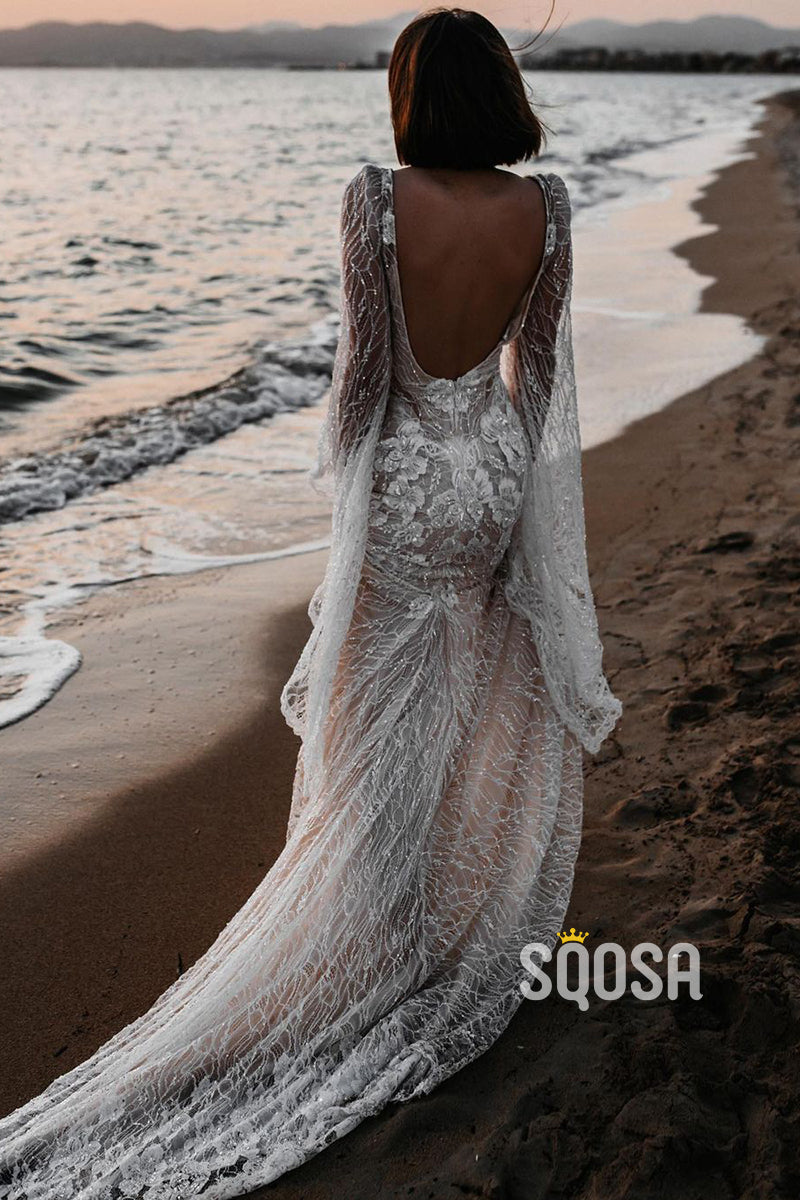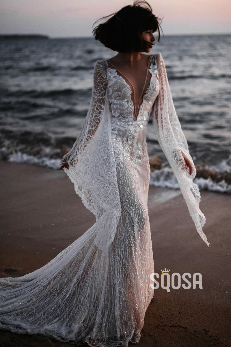 Plunging V-neck Bat Sleeves Lace Bohemian Wedding Dress QW2658