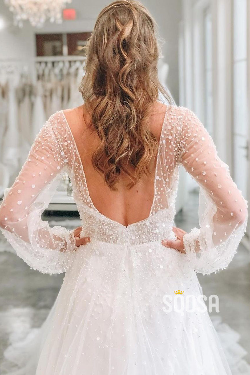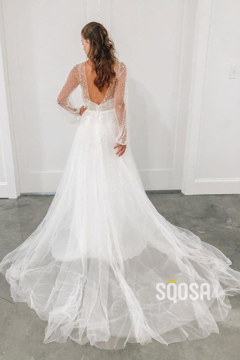 A-line V-neck Long Sleeves Sparkly Wedding Dress QW2672