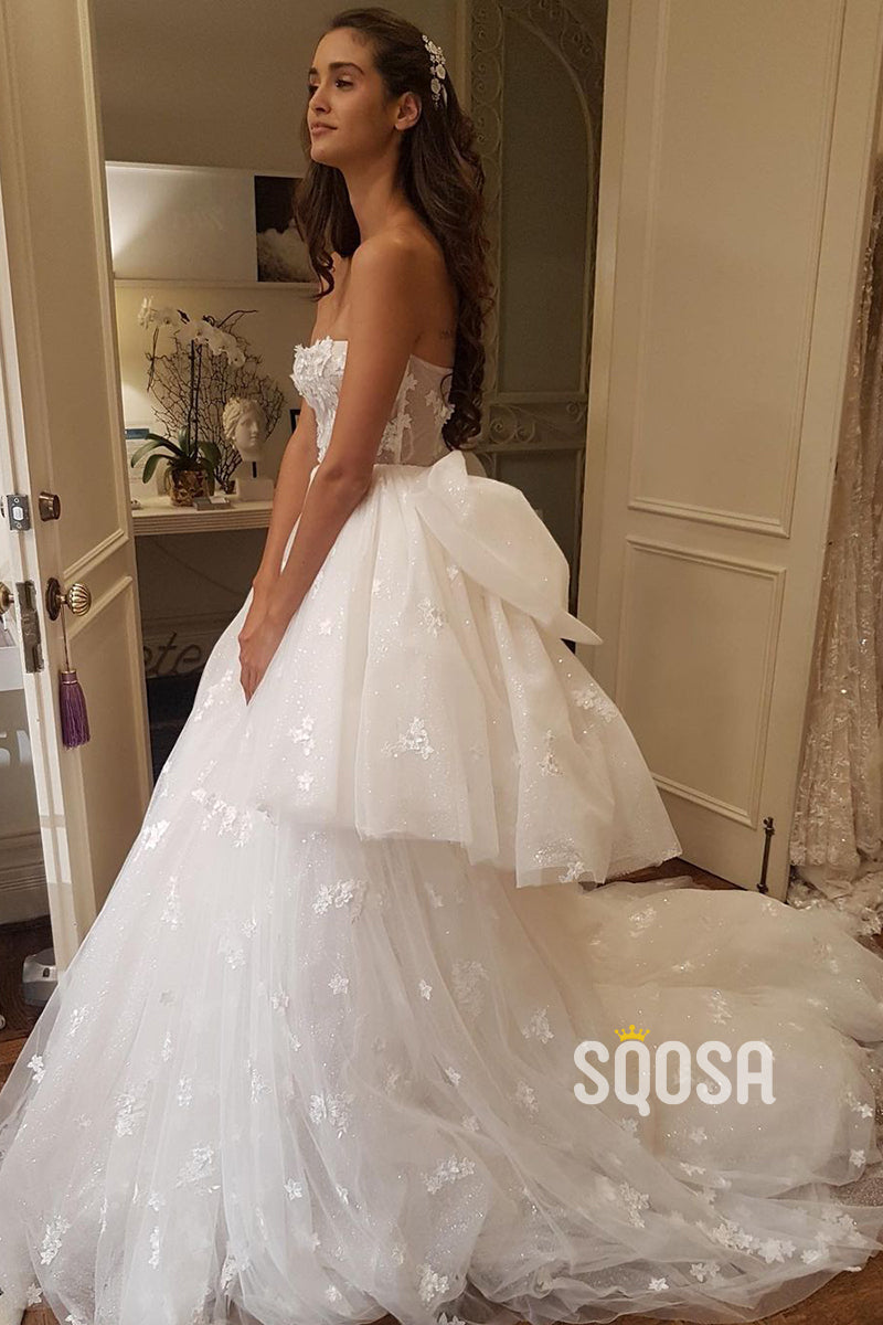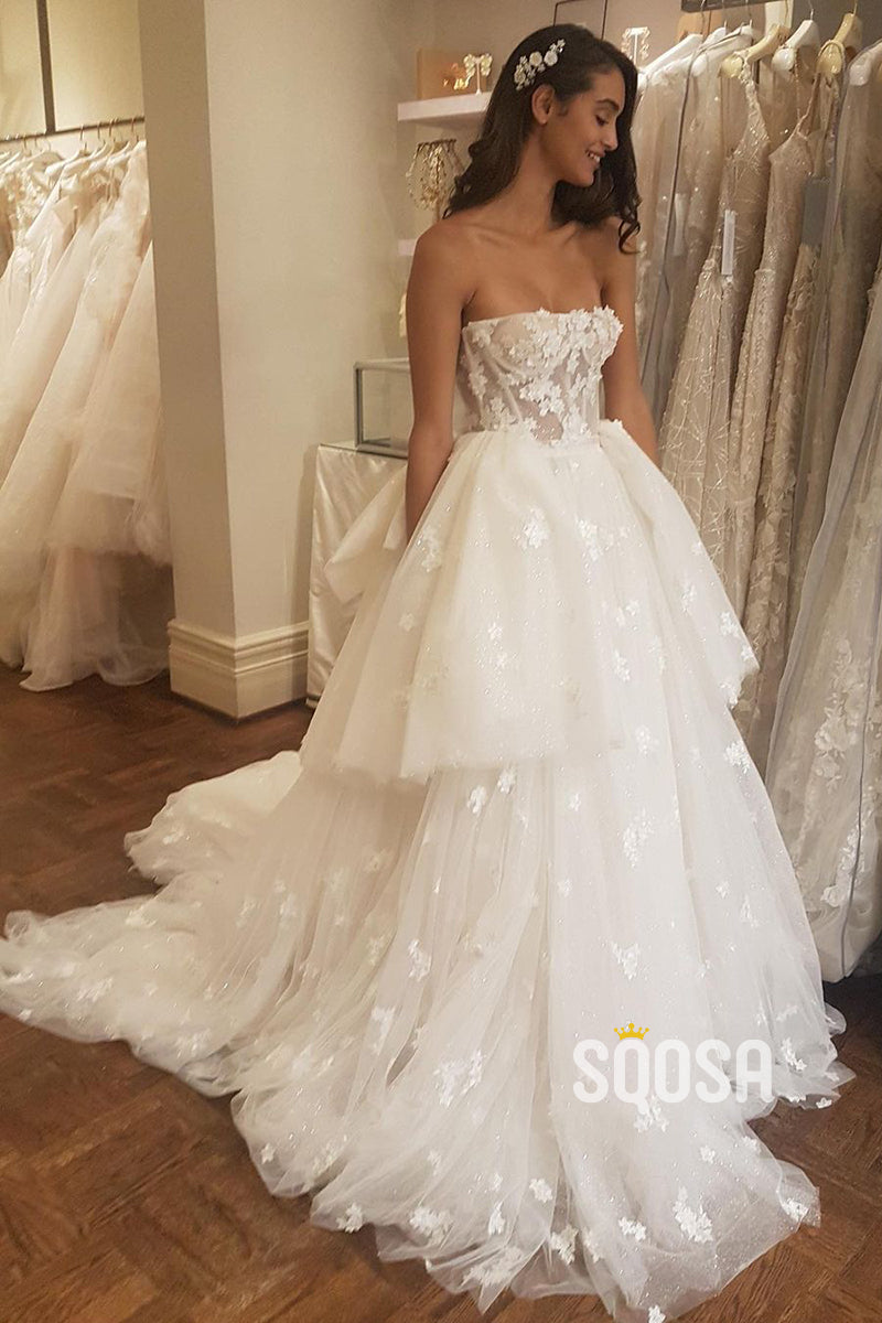 Unique Strapless Tulle Appliques A-line Wedding Dress QW2687