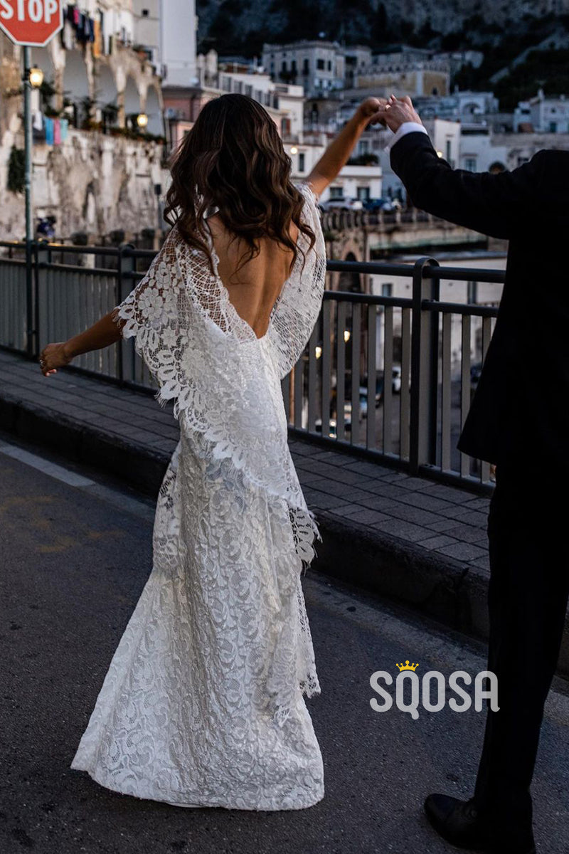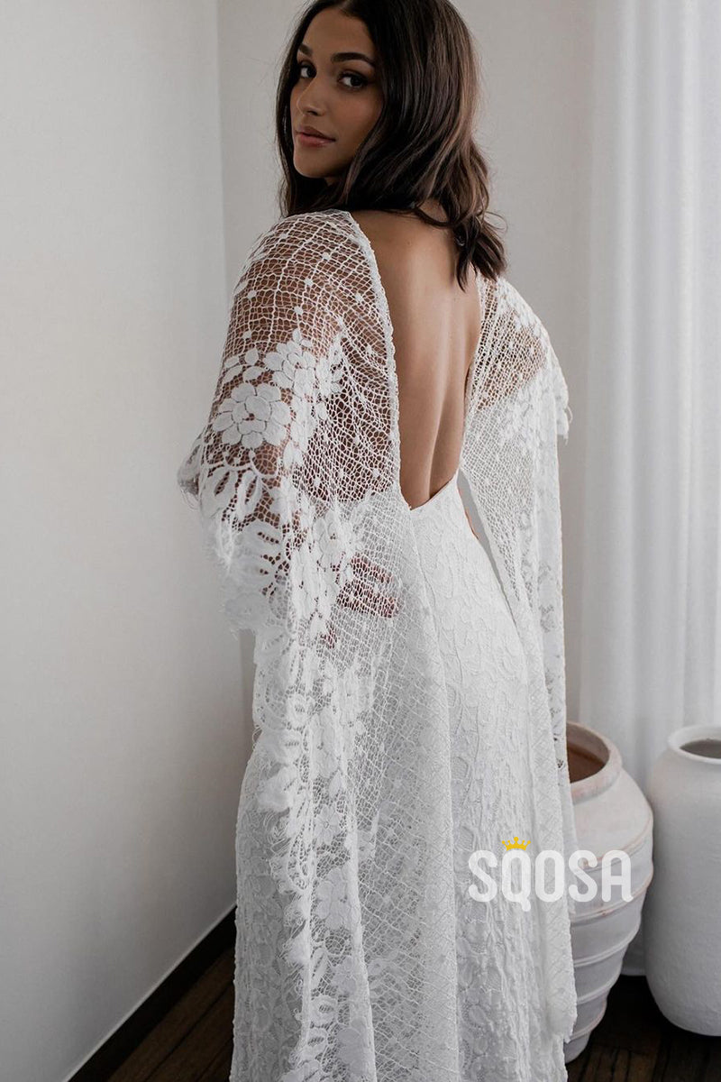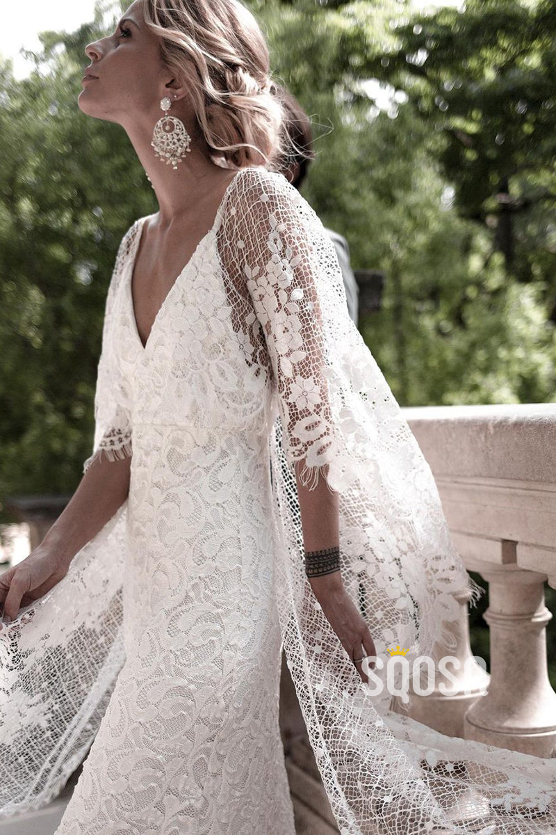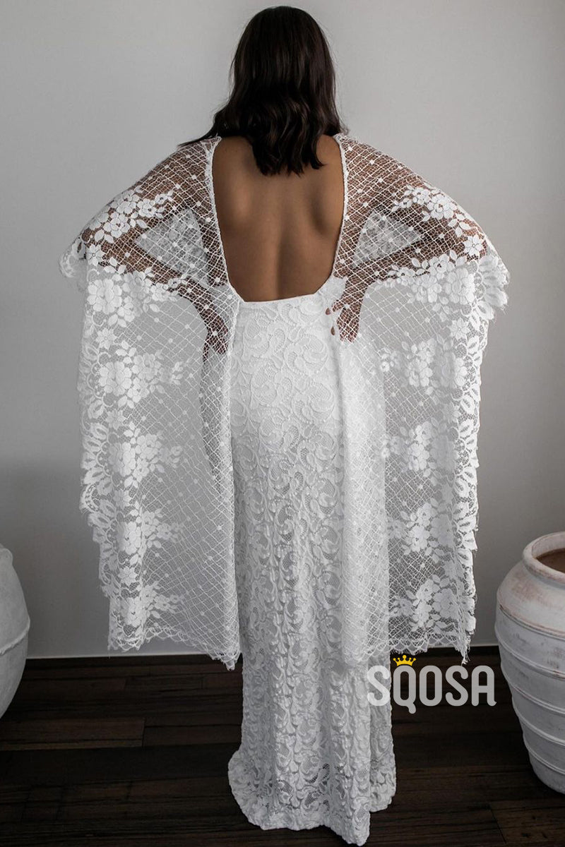 Unique Bat Sleeves V-neck Lace Bohemian Wedding Dress QW2694