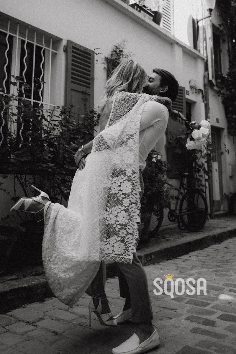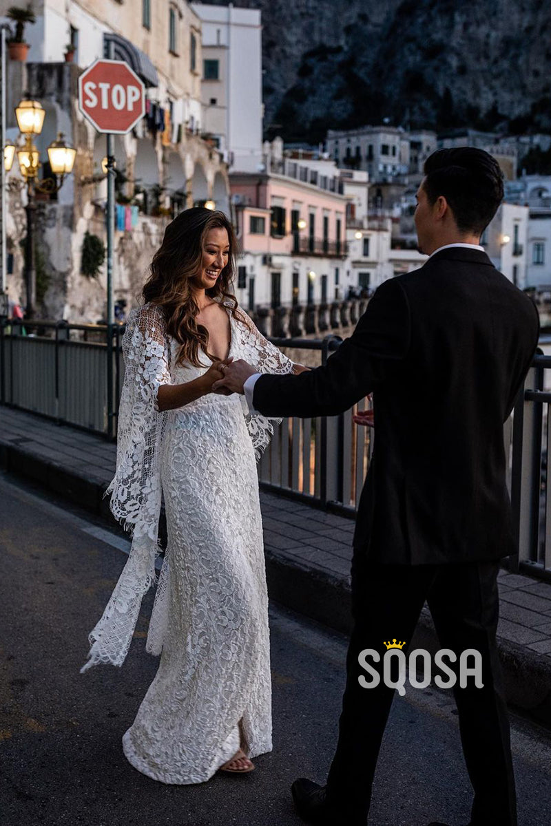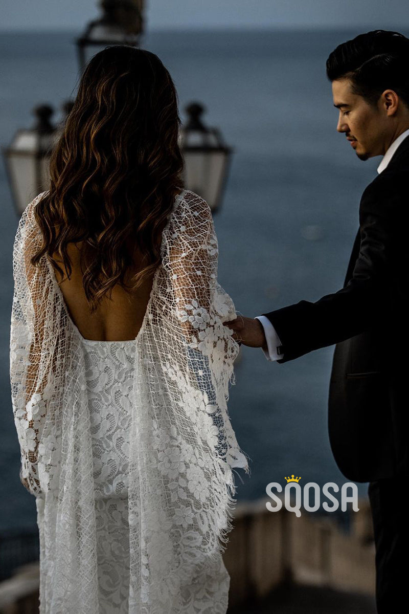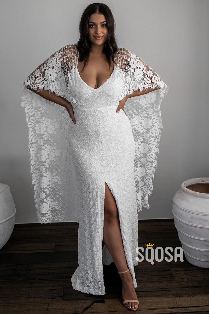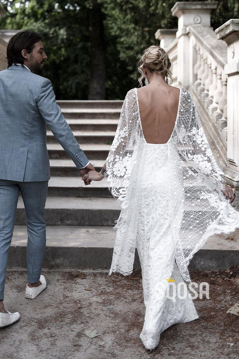 Unique Bat Sleeves V-neck Lace Bohemian Wedding Dress QW2694