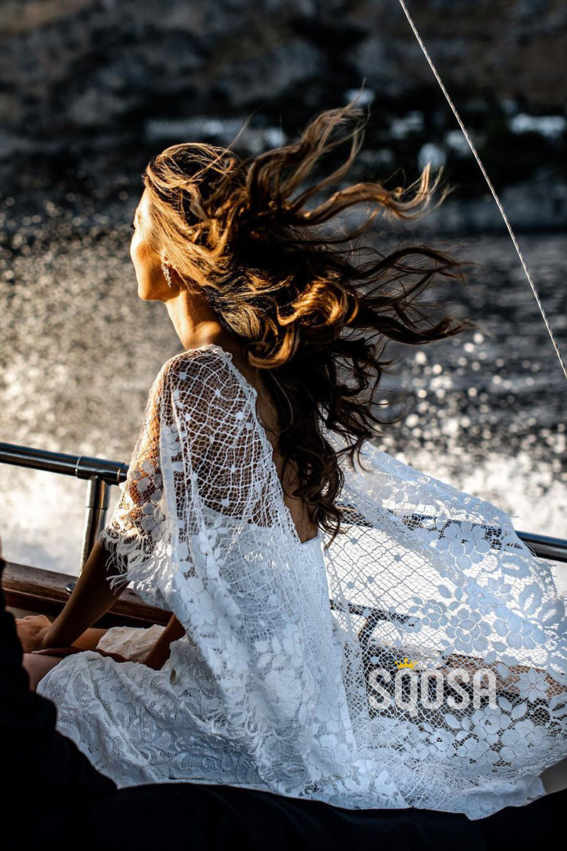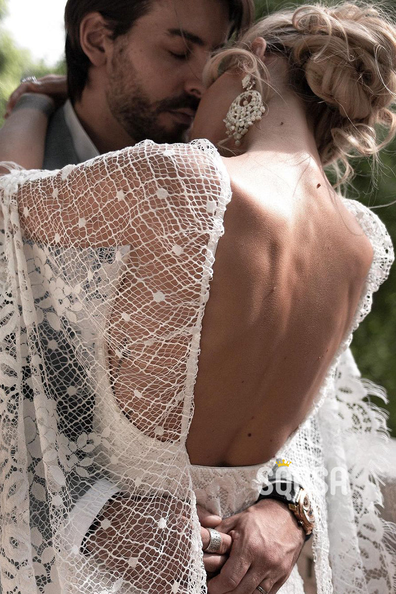 Unique Bat Sleeves V-neck Lace Bohemian Wedding Dress