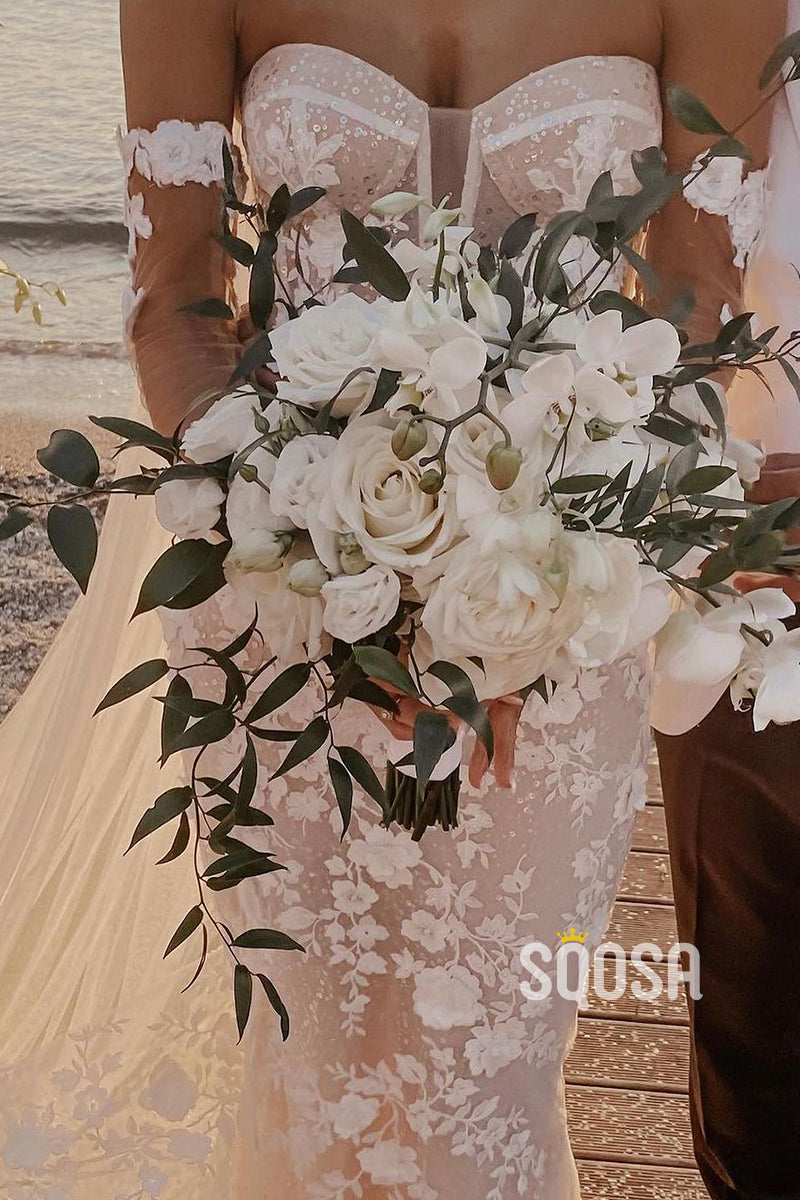 Sheath Mermaid Sweetheart Floral Illusion Sleeves Wedding Dress Bridal Gown