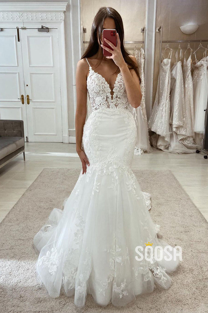 V-Neck Spaghetti Straps Lace Applique Empire Two Tone Trumpet Wedding Dress QW8116