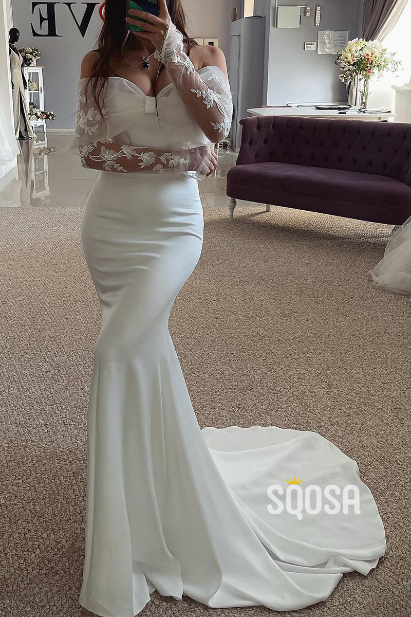Off-Shoulder Long Sleeve Trumpet Appliques Beach Wedding Dress QW8152