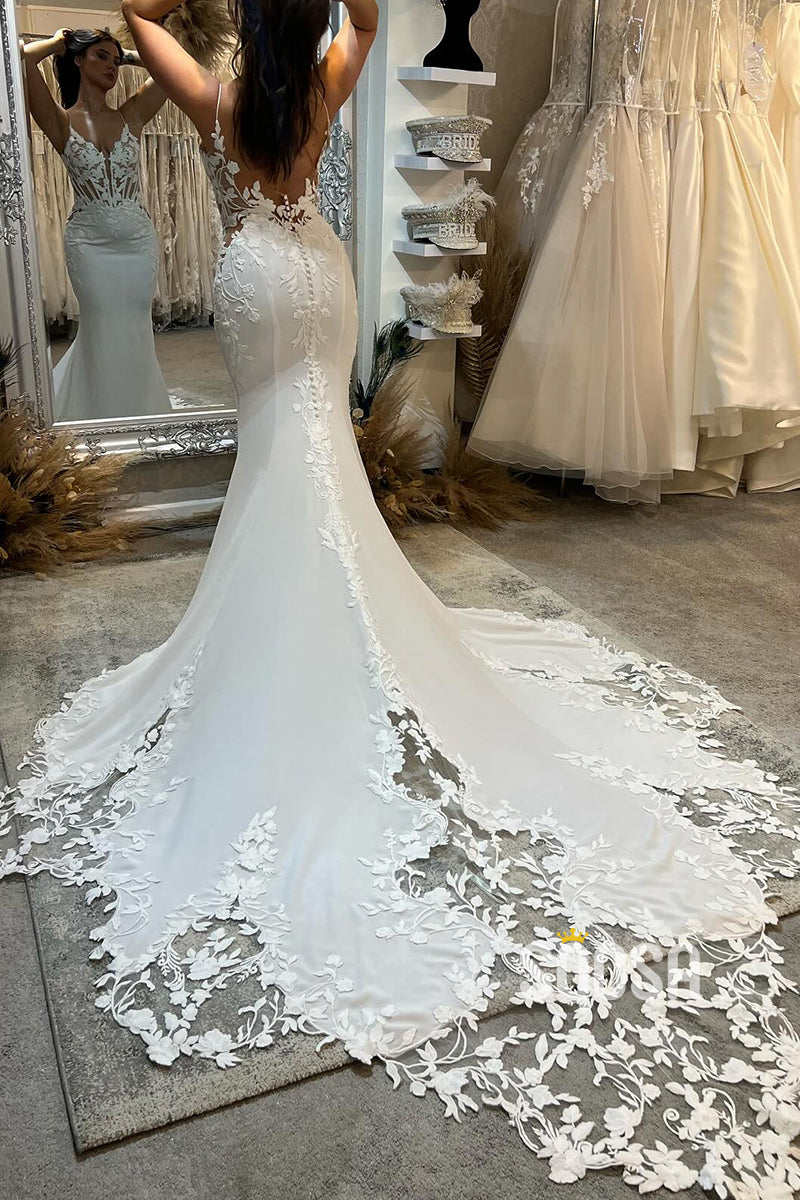 V-Neck Spaghetti Straps Illuion Appliques With Train Wedding Dress