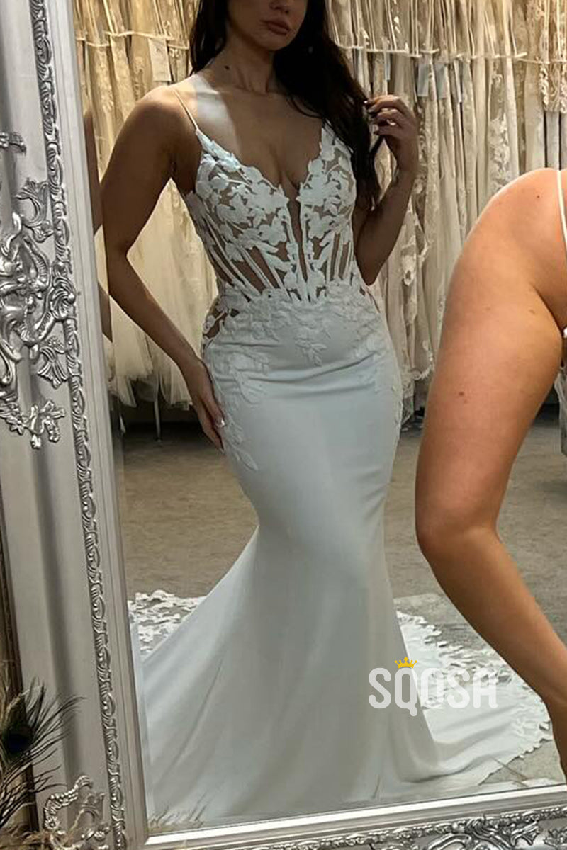 V-Neck Spaghetti Straps Illuion Appliques With Train Wedding Dress QW8158