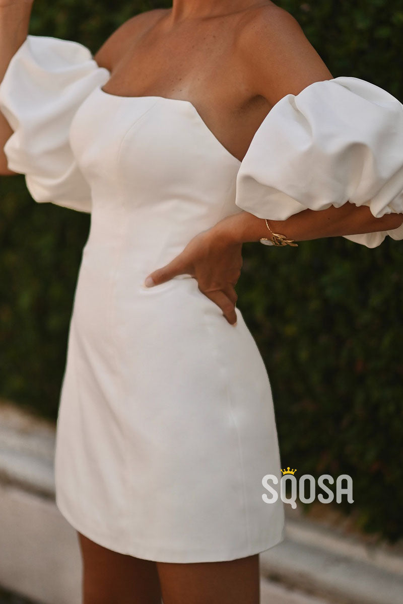 This QW8176 Satin A-Line Wedding Dress offers a sophisticated and elegant style with its bateau neckline, puff sleeves, and detachable train. The satin fabric provides a luxurious and smooth feel, perfect for a bride looking for both comfort and style on her special day.