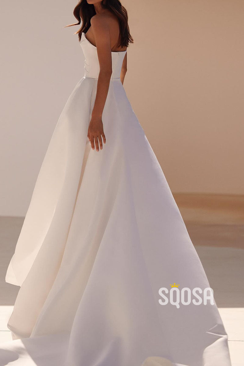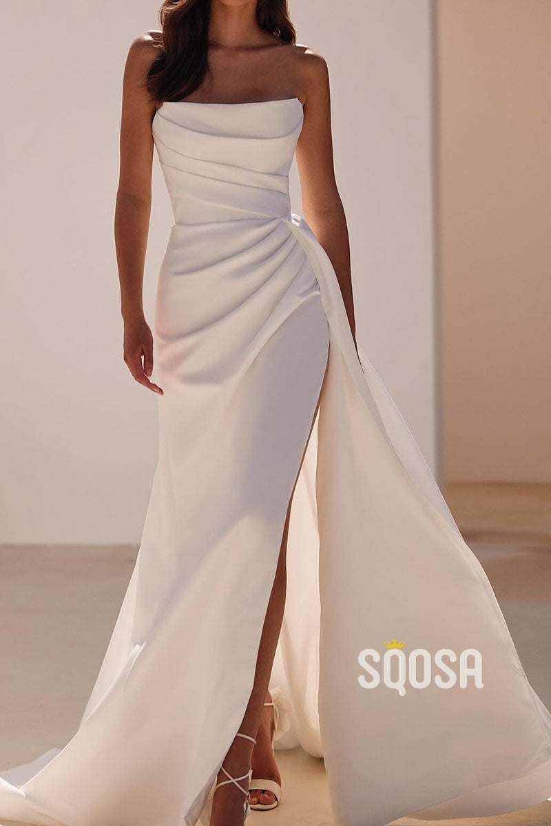 Satin Bateau Sleeveless Empire Pleats With Side Slit Wedding Dress QW8183
