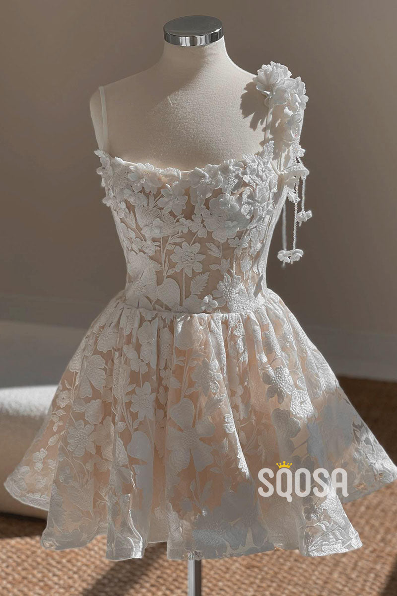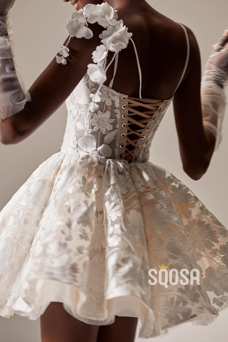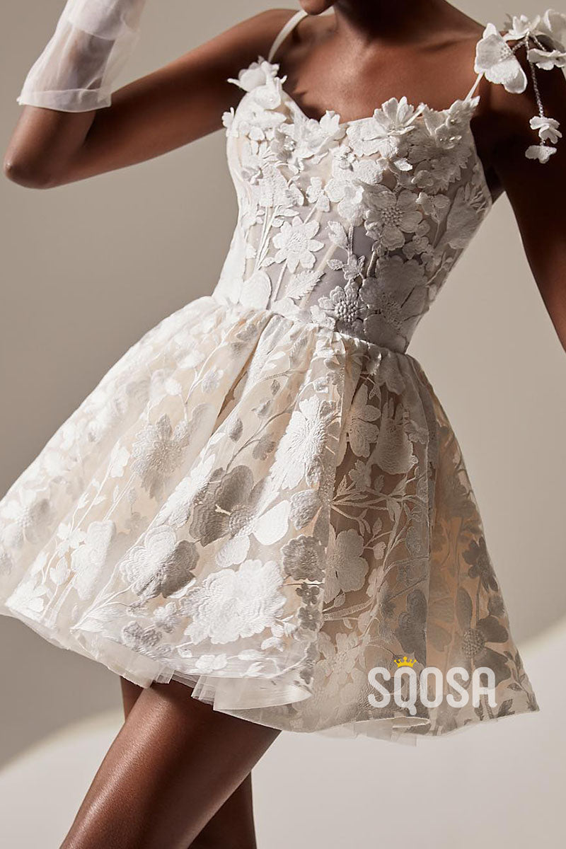 QW8186 - Chic A-Line Bateau Spaghetti Straps Lace Applique Short Wedding Dress