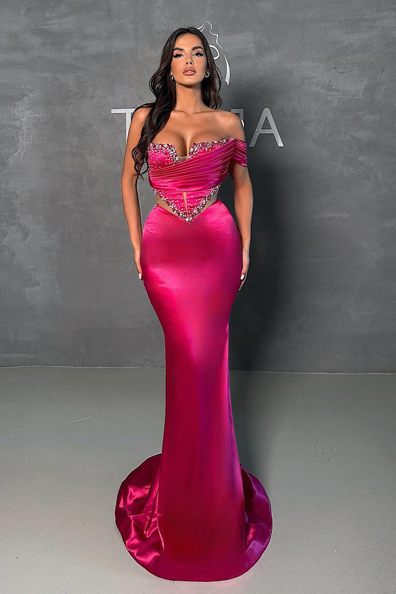 Strapless Satin Pleats Beads Mermaid Formal Evening Dress