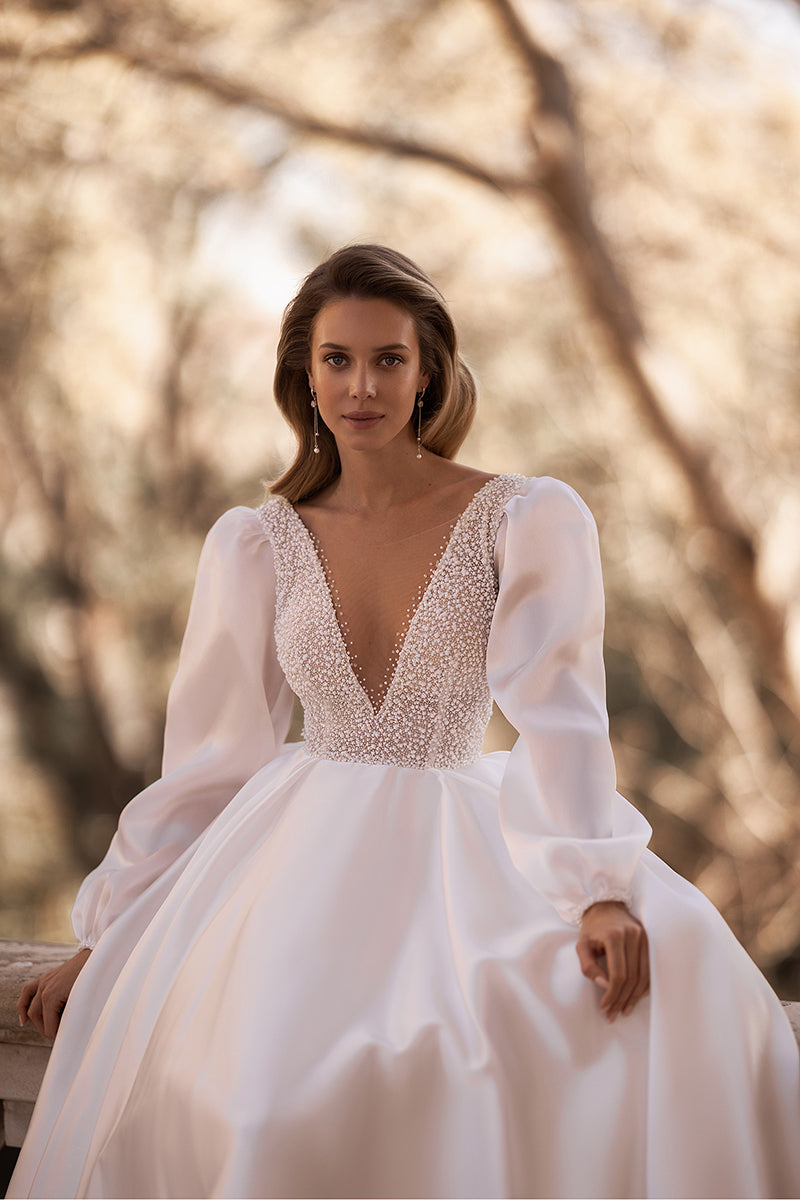 A Line Illusion V Neck Luxury Pearls Long Sleeves Rustic Wedding Dress QW0856
