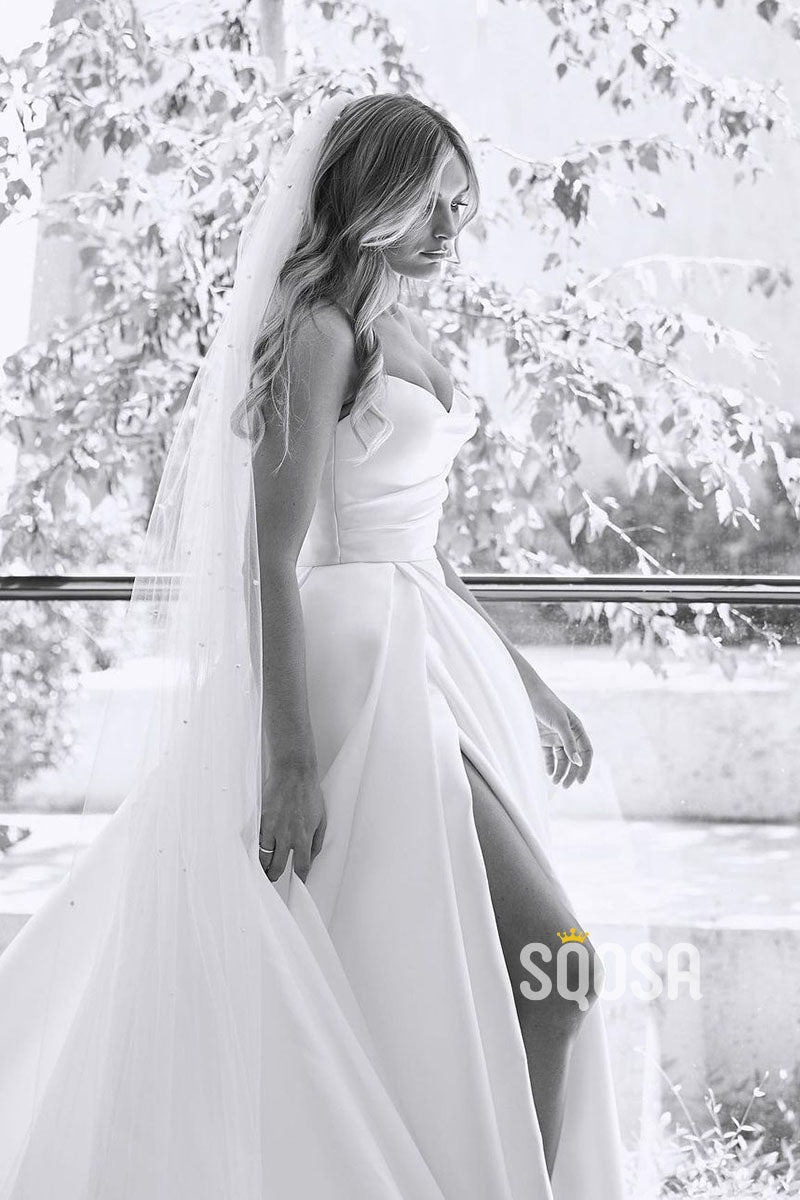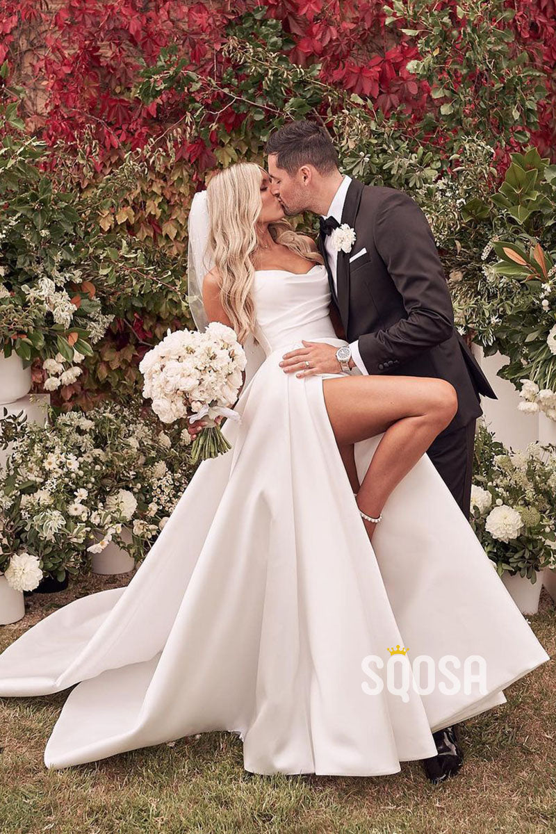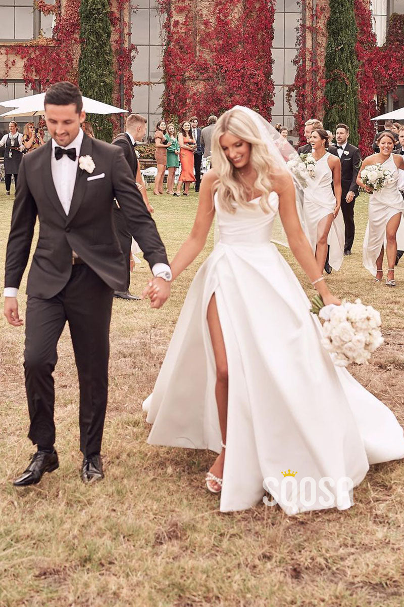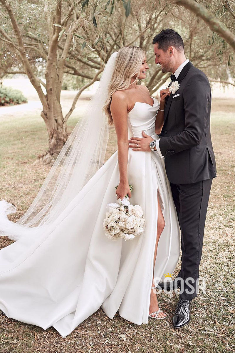 Strapless Ivory Satin Pleats High Split Rustic Wedding Dress QW0931