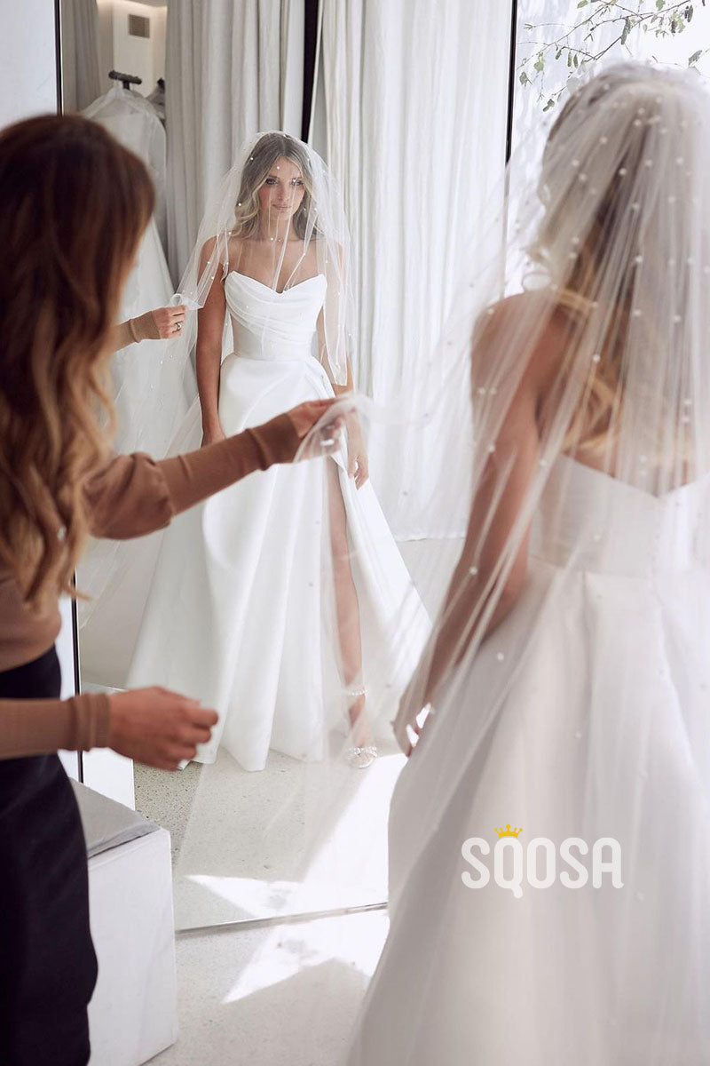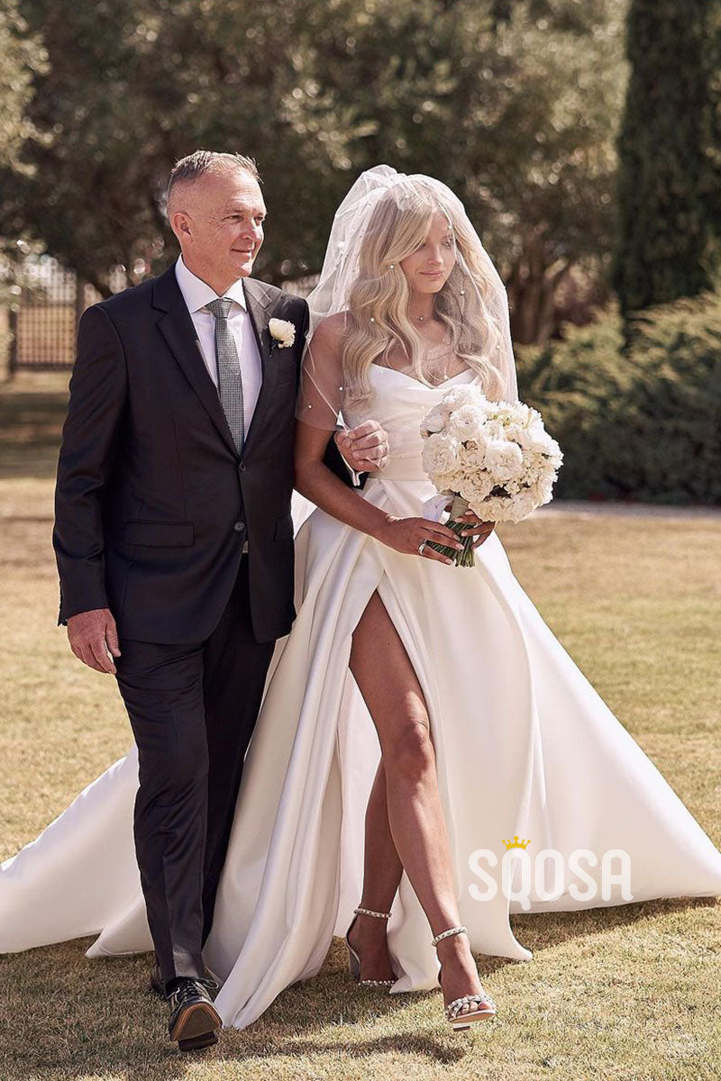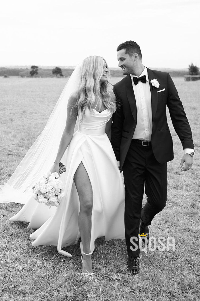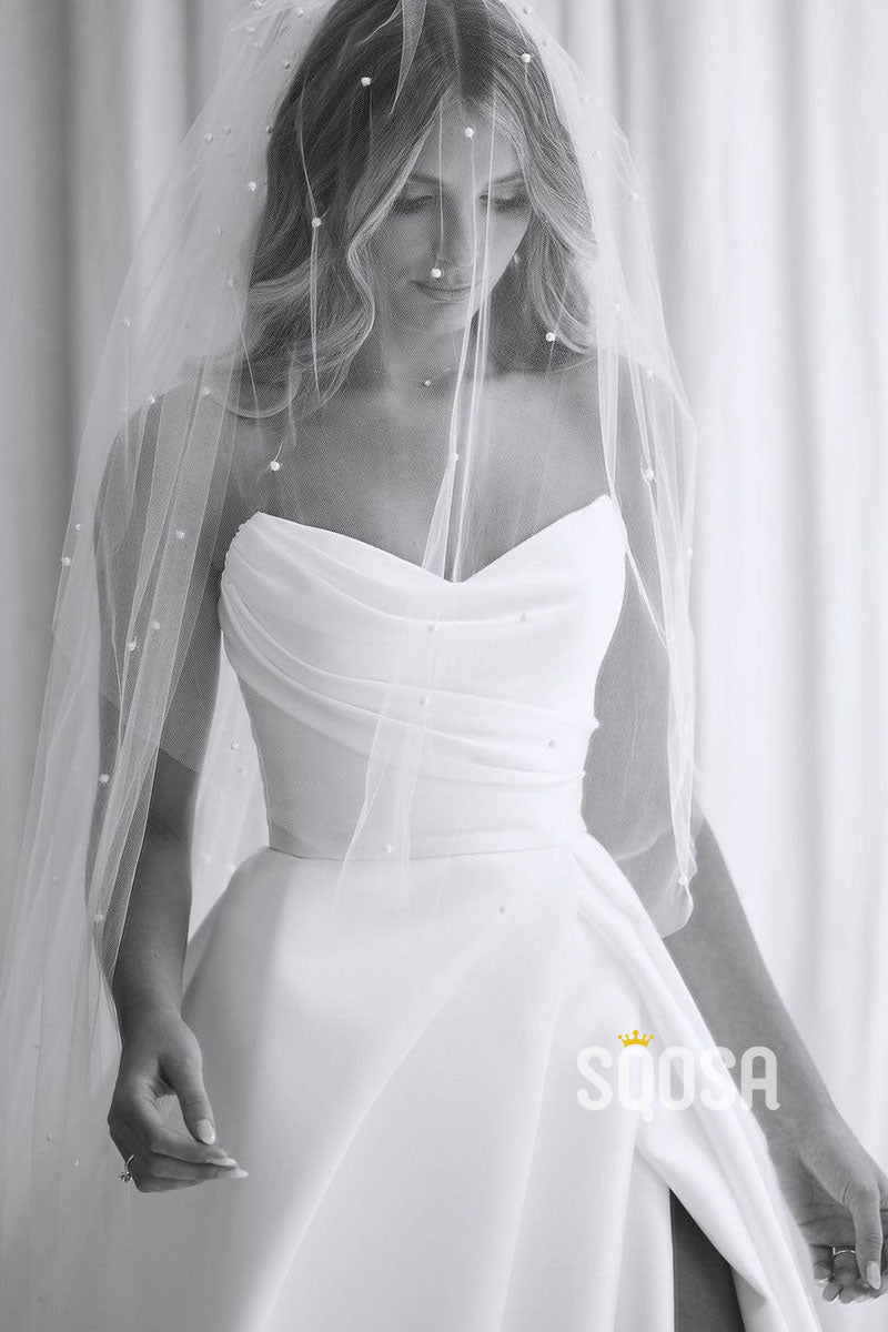 Strapless Ivory Satin Pleats High Split Rustic Wedding Dress QW0931
