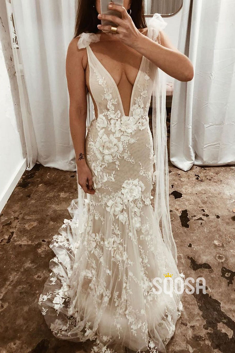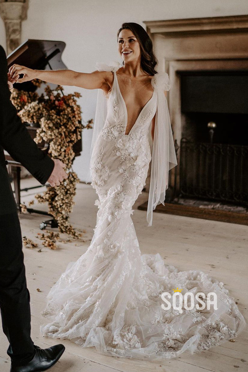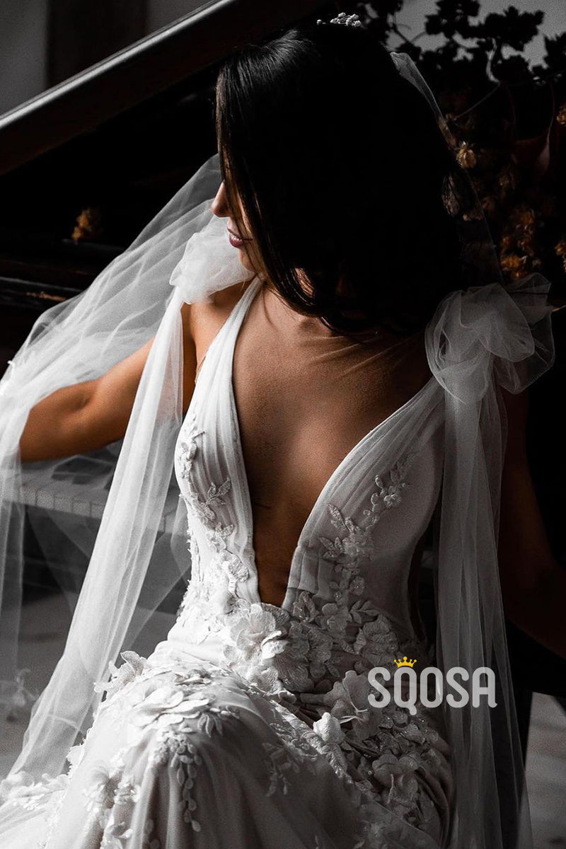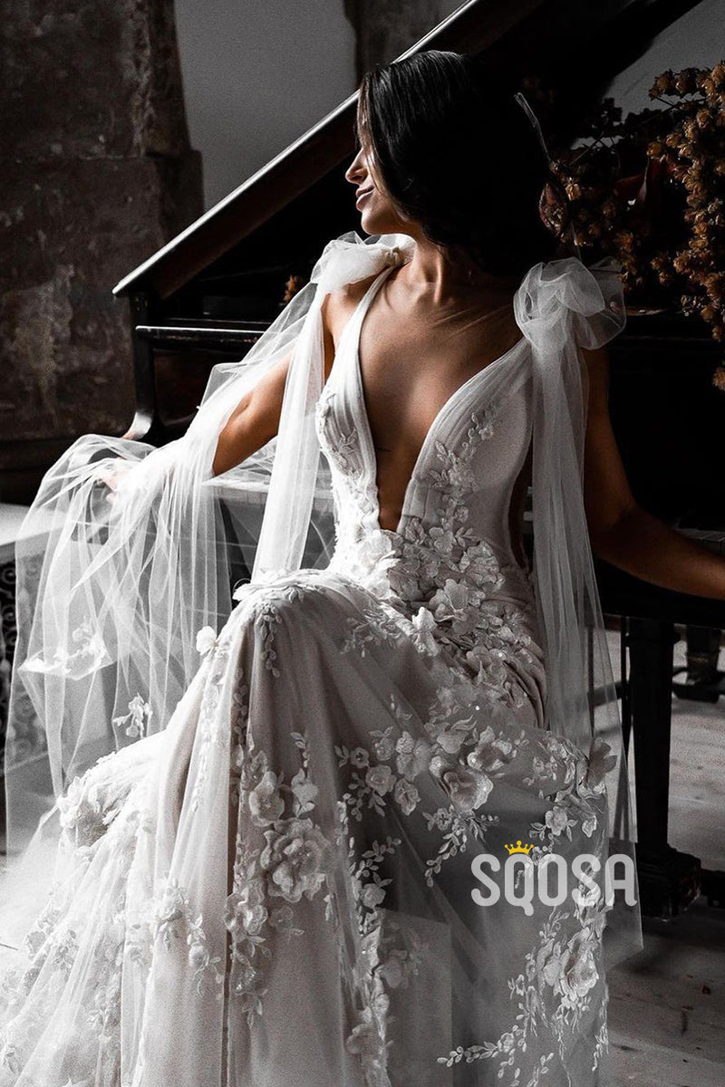 Plunging V-Neck 3D Lace Wedding Dress Bohemian Bridal Gown QW2208