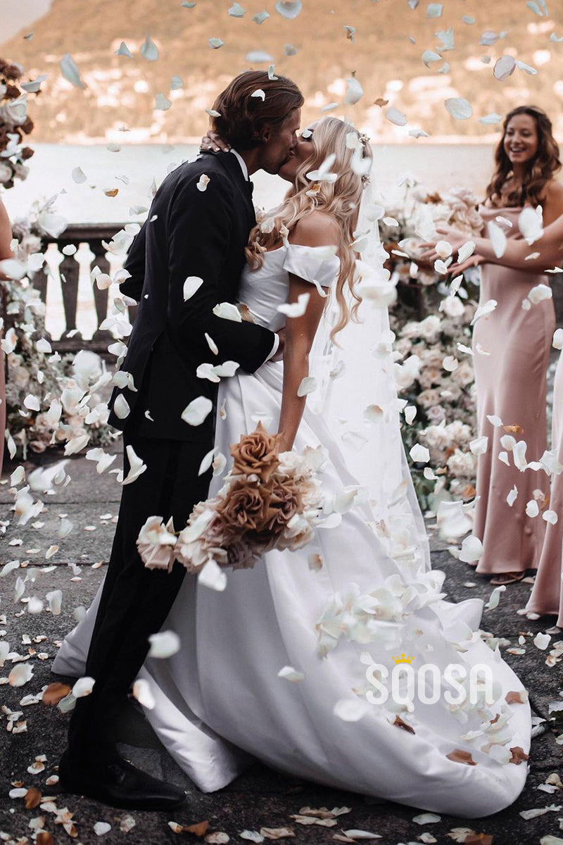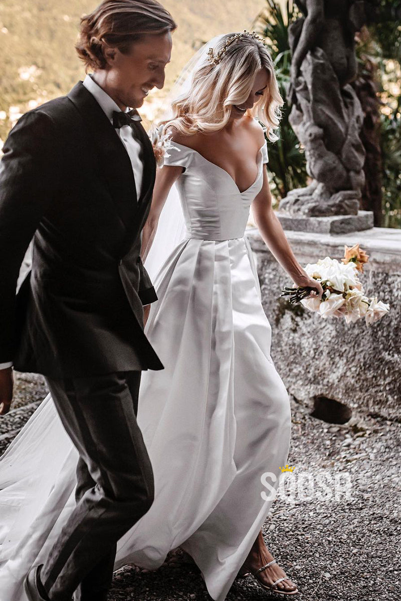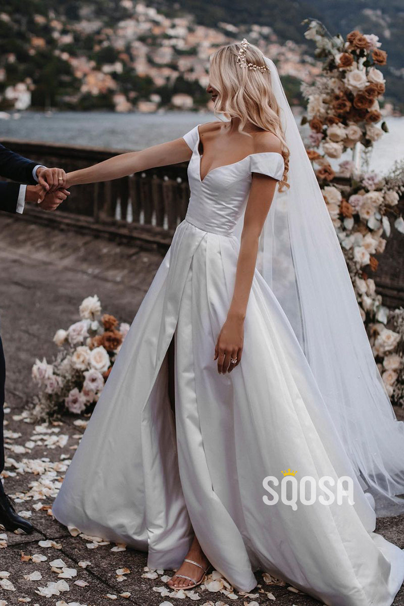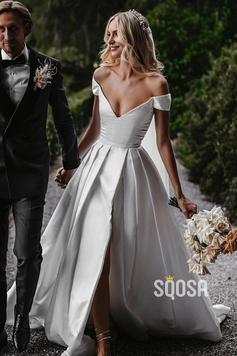 Off Shoulder Modest White Satin Rustic Wedding Dress with Slit QW0901