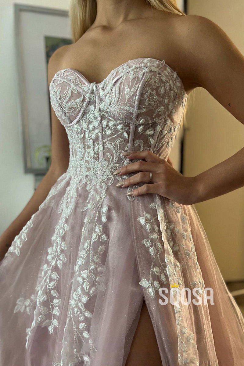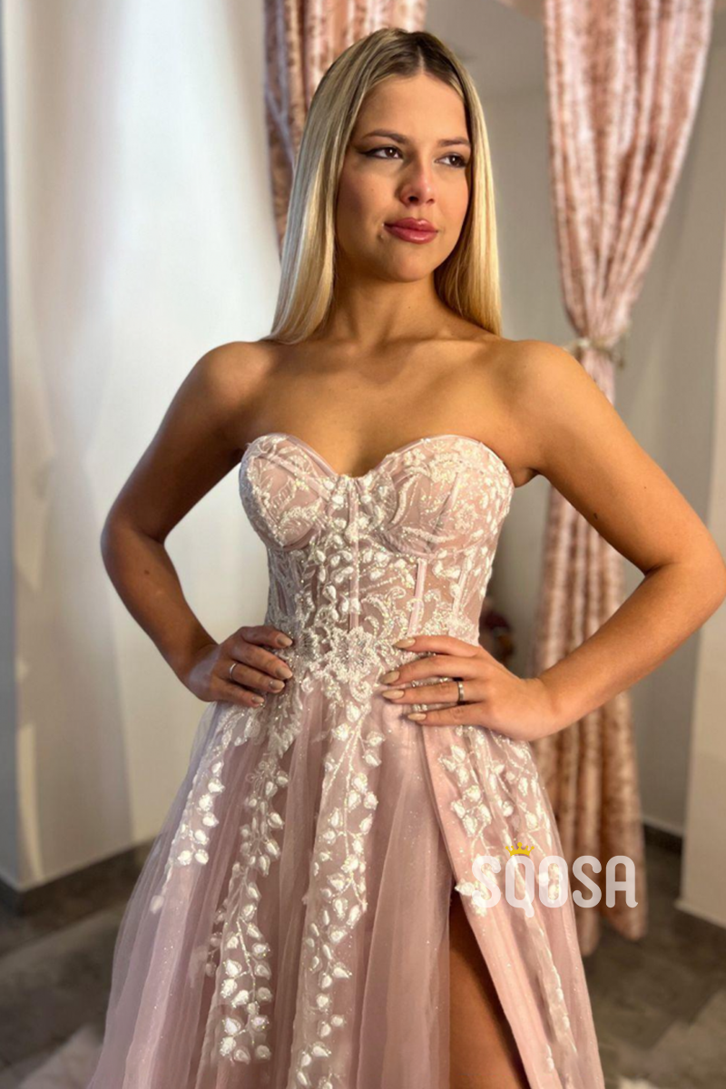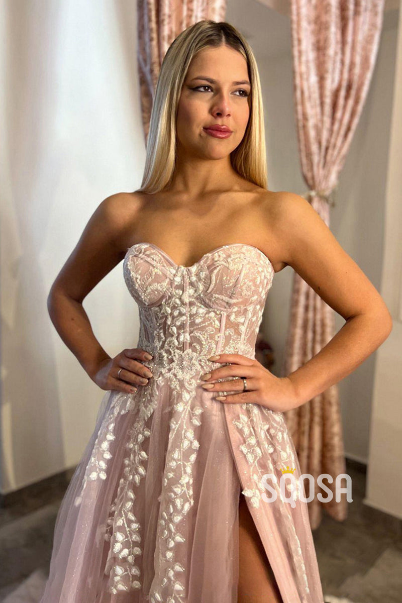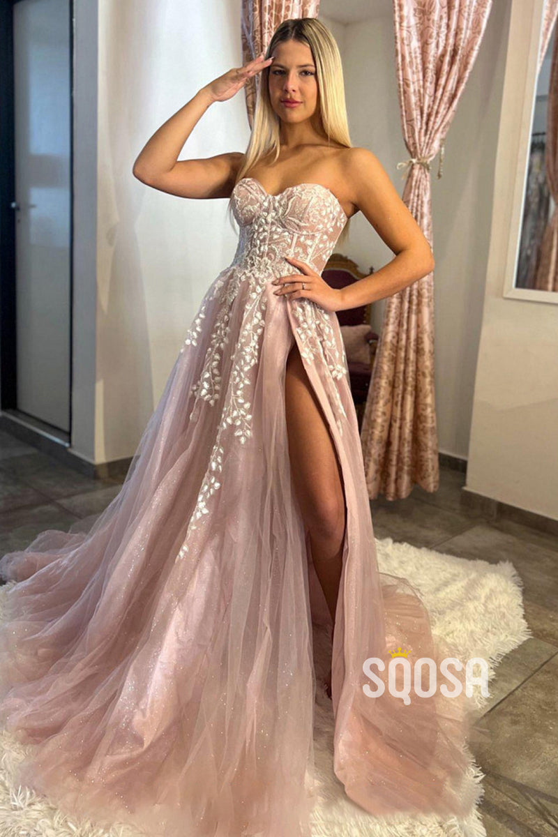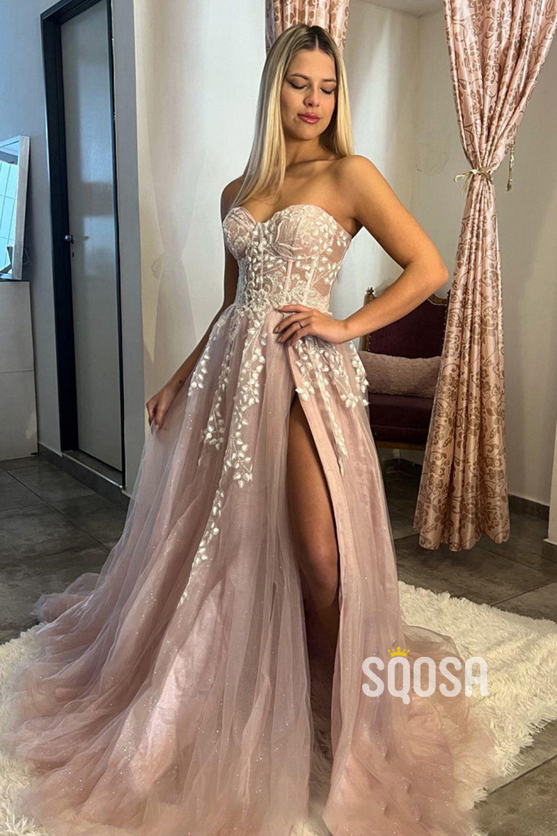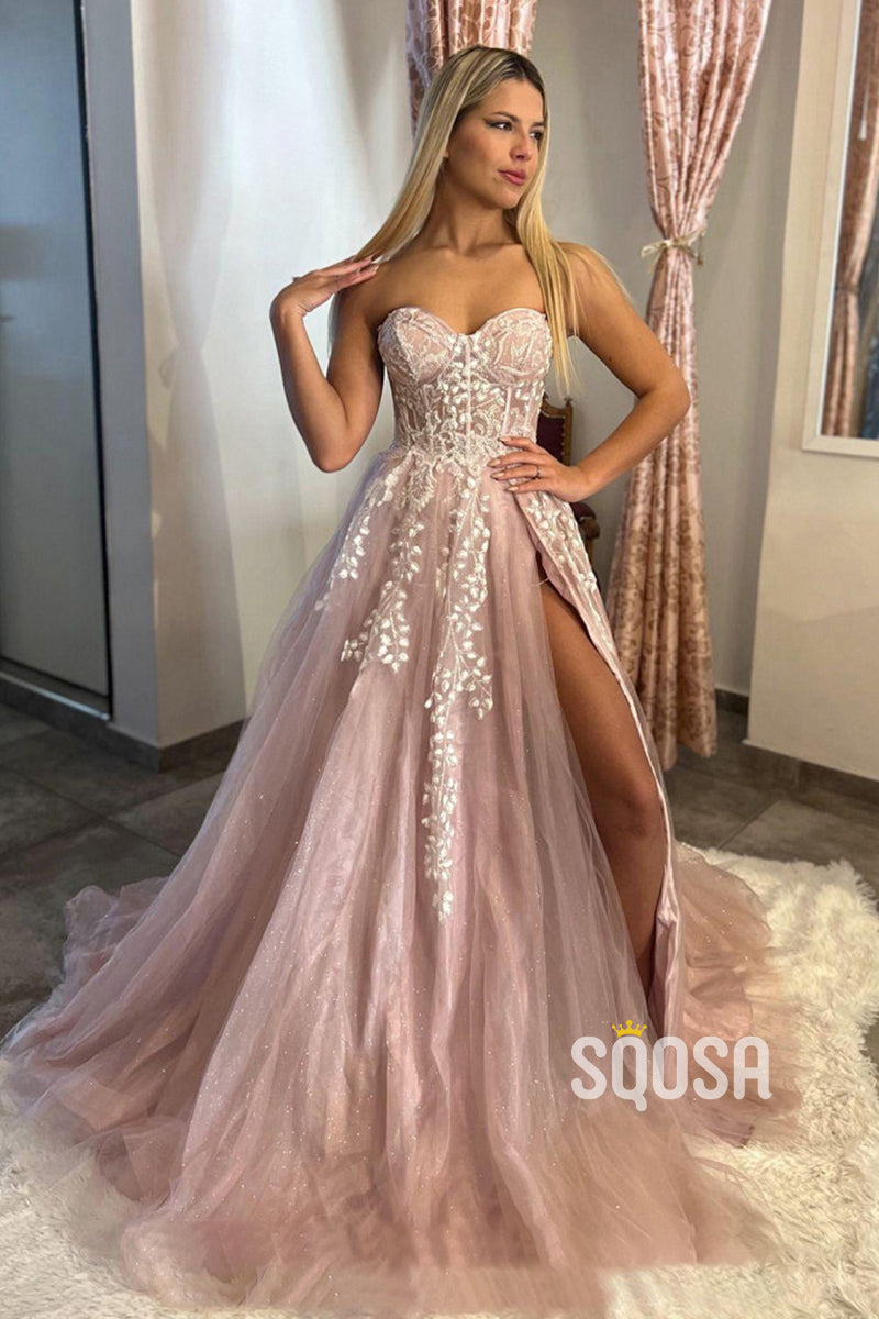 A-line Sweetheart Lace Appliques Pink Long Prom Dress QP0853